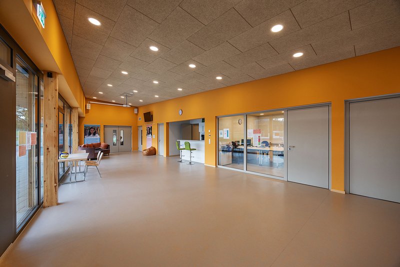 Über den Windfang gelangt man ins Foyer, welches in den Chill-Bereich mit Bar übergeht. Eine großzügige, zusammenhängende Fläche entsteht. Die Gruppenräume sind nach Norden und Osten orientiert. Im südlichen Gebäudeteil ist der Bandraum verortet. Die Nebenräume sind zur Straßenseite hin ausgerichtet. Die öffenbaren Fenster-Elemente der Gruppenräume befinden sich auf der Nordseite, die des Bandraumes auf der Südseite, also jeweils von der Wohnbebauung im Osten abgewandten Seite. Die Sanitärräume können über das Foyer und unabhängig von den Öffnungszeiten des Jugendhauses auch von außen erschlossen werden.