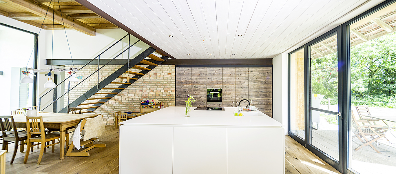In die ursprüngliche Statik des Stadels wurde eine neue, hochgedämmte Holzkonstruktion eingestellt: „Hülle in Hülle“. Es entstand eine lebhafte, dreidimensionale Wohnlandschaft.Um für genügend Belichtung zu sorgen, wurden in die Südfassade großzügige Öffnungen eingeschnitten. Die Ansicht wurde dadurch aufgewertet. Im Eingangsbereich wurde die charakteristische Kappendecke unbehandelt belassen. Der Koch- und Essbereich lebt von den raumhohen Verglasungen und der ursprünglichen Höhe der Tenne.In Verlängerung der Tenne befinden sich nach Osten und Westen überdachte Terrassen, die die Großzügigkeit des offenen Wohnens nach draußen weiterführen. Die weitere Gestaltung der Außenanlagen wird Schritt für Schritt passend zum Leben mit Kindern und Tieren gestaltet.