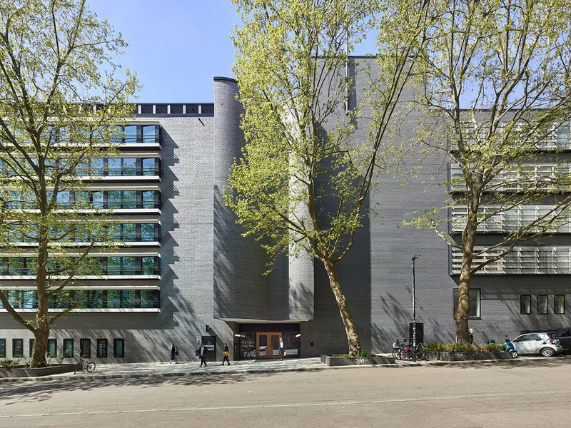 Der Hotel-Neubau orientiert sich in der Gebäudehöhe am bestehenden Verwaltungsbau. Die vorhandenen Straßenkanten werden ebenso aufgenommen wie das Farb- und Materialkonzept. Die Fassade aus beinahe schwarzem Klinker mit Betonung der Horizontalen durch weiße Lagerfugen greift auf den Neubau über. Auch die horizontale Gliederung durch die über die Mauerwerksfassade hervortretenden Fensterbänder wird übernommen. Der ganz durchgebrannte und dadurch bläulich-schwarze, englische Stein wurde ursprünglich im Kanalbau verwendet, und wurde in den 1990er Jahren ausnahmsweise im Normal- statt im englischen Format hergestellt. Nach langer Recherche konnte für den Neubau ein identischer Stein bei einem deutschen Hersteller gefunden werden.