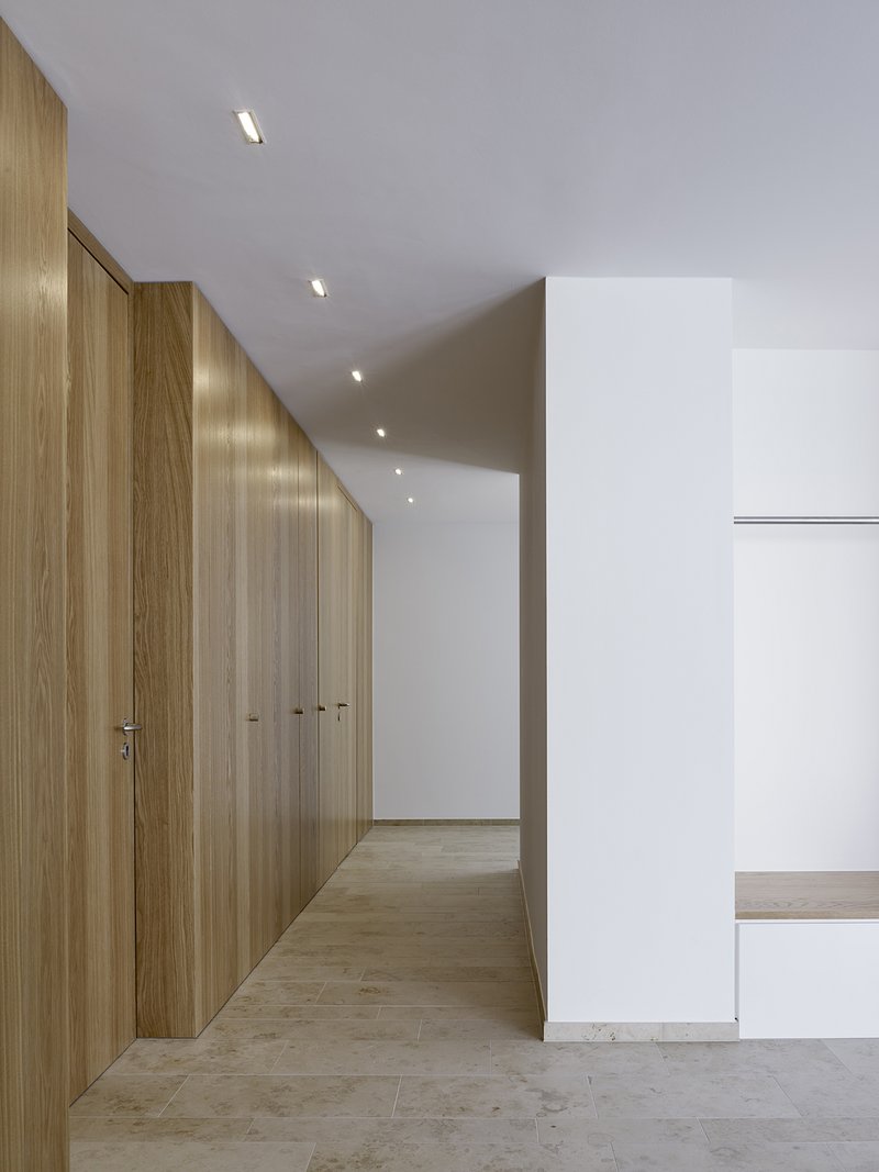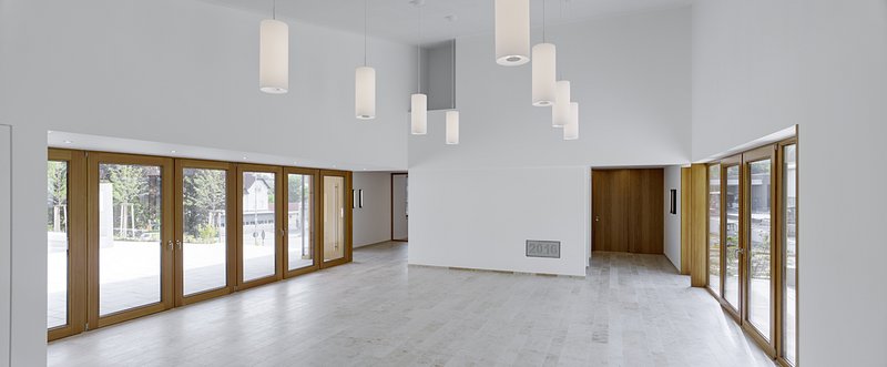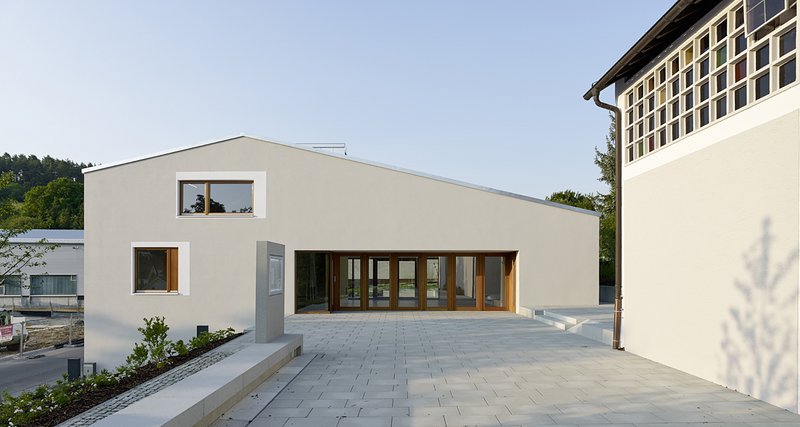 Das Gemeindehaus selbst verfügt über drei Ebenen und ist hart an die Straßenkante gesetzt. Das Gemeindebüro mit Mehrzweckraum wird vom Kirchplatz aus, auf der zweiten Ebene, erschlossen. Es verfügt neben den Diensträumen des Pfarrers über eine Teeküche und Toiletten, die barrierefrei von der Kirche aus erreichbar sind. Die Lage am Kirchplatz, auf Augenhöhe mit der Kirche, dient der Adressbildung und bietet die Möglichkeit, bei Festveranstaltungen den Kirchplatz mit einzubeziehen.Der Veranstaltungsraum verfügt über eine größere Höhe als die übrigen Bereiche des Hauses und lässt sich zum Kirchplatz hin öffnen, sodass bei Gemeindefesten eine Einbeziehung der Platzfläche möglich ist. Zudem lässt sich der Saal zum Verwaltungstrakt hin mit einer mobilen Wand abschließen. In der oberen Etage befinden sich weitere kleinere Veranstaltungsräume; im Untergeschoss sind der Jugendraum mit separatem Außenzugang sowie Lager-, Sanitär- und Technikräume untergebracht.Der Baukörper des neuen Gemeindehauses ist als einfacher, in seiner präzisen Ausformulierung fast archaisch anmutender Putzbau aufgeführt. Das eingelegte Satteldach nimmt die zurückhaltend-elegante, erdtonige Farbigkeit der Außenwände auf, gegen die die weißen Putzfaschen der Fensterumrahmungen deutlich abstechen. Im Innern schaffen strahlend weiß verputzte Wände und Decken sowie ein warmtoniger Boden aus Juramarmor eine freundliche, lichte und zeitlose Atmosphäre.