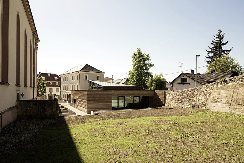 NeubauStädtebaulich ordnet sich das neue Gemeindehaus in das kräftige Thema der umschließenden Kirchhofmauer ein. Das eingeschossige Gebäude passt sich an das Gelände an und führt die Mauer fort. Die Fassade aus Stampfbeton lässt das Gemeindehaus wie eine Verlängerung der alten Mauer aussehen. Ebenso wie diese hat der Stampfbeton eine lebendige, natürliche Struktur, weist durch verschiedene Mischungen vielschichtige Farbtöne auf und wird in Lagen unterschiedlicher Höhe ausgeführt. So wird das Neue mit dem Alten verbunden.Im eingeschossigen Neubau befinden sich ein Gemeindesaal, ein Foyer und Nebenräume. Mit seinem einladenden Foyer öffnet sich der Neubau zum Kirchplatz, im rückwärtigen Bereich öffnet sich der neue Gemeindesaal zum Kirchgarten. Die Organisation des Gemeindehauses lässt vielseitige Nutzungen zu. So liegt z.B. die Küche am Saal sowie am Foyer und hat auch eine Ausgabe zum Kirchplatz. Für eine gleichmäßige Verteilung der natürlichen Belichtung im Saal sorgen die großen Oberlichter im Dachaufsatz. Die Innenraumgestaltung ist geprägt von hellen Wand- und Deckenflächen.