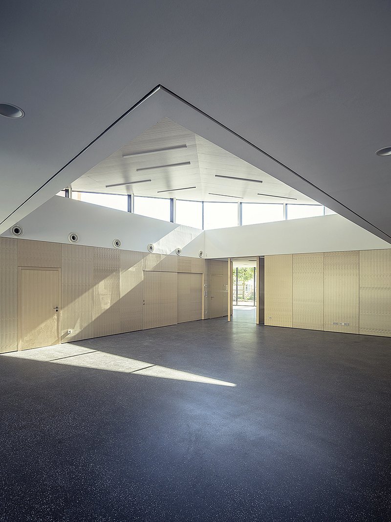 Das Gemeindehaus umfasst die Sanierung und Renovierung des denkmalgeschützten Bestandsgebäudes und den Neubau des Gemeindesaals mit Nebenräumen. Altbau und Neubau stärken sich in ihrem Charakter gegenseitig und bilden ein stimmiges Ensemble.