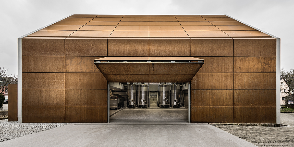 Umgesetzt ist dieses Gebäude in der ortstypischen Gebäudeform eines Hauses mit Satteldach, im Untergeschoss verbunden mit dem bestehenden Keltereibetrieb. Erstellt wurde die Kelter in Ortbeton mit Holzdachstuhl. Die Giebelwände in Sichtbeton fassen die über Traufseiten und Dach gefaltete vorgehängte Cortenstahl – Fassade ein. Die gewählten Materialien, Cortenstahl und Sichtbeton, sind lebendig. Sie verändern langsam ihre Oberfläche und reifen im Lauf der Jahre in Würde, wie der im Gebäude gekelterte Wein.