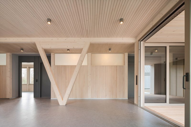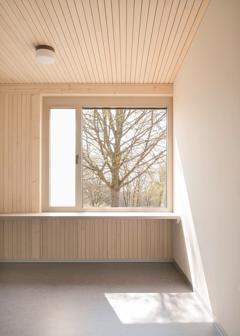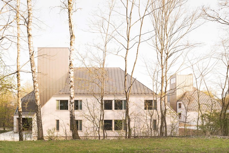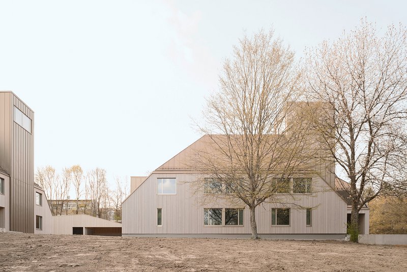 Die Gebäudegruppe besteht aus dem Langhaus mit einer Wohngruppe, das benachbarte U-Haus nimmt zwei Hausgemeinschaften auf. Die Hausleitungen haben hierbei eine jeweils abgetrennte Wohnung unter einem gemeinsamen Dach. Das Ensemble wird durch einen Spielschuppen vervollständigt, der die erforderlichen Transporter- und Fahrradstellplätze für die insgesamt etwa 36 Bewohner aufweist. Die Gebäude sind so zueinander geordnet, dass ein geschützter Spielhof entsteht. Die Gebäudeform mit Steildach stellt den Archetyp des Hauses dar, der den Kindern Schutz und Geborgenheit vermittelt. Markant sind die drei Türme, die je zwei Treppenhäuser für die Hausleitung und Kinderbereich aufnehmen. Zudem übernehmen sie zur Durchlüftung und Nachauskühlung die Funktion eines thermischen Kamins. Die Gebäude sind als reine Holzbauten in Holzrahmenbauweise errichtet. Die innere Raumschale der Außenwände sowie die Geschoßdecken sind mit einer Diagonal-Dübel-Holzkonstruktion gebaut. Auf abgehängte Decken- und Installationsebenen wurde weitgehend verzichtet. Größere Spannweiten sind mit V-Stützen ausgeführt. So bleibt ablesbar und verständlich, wie das Gebäude gefügt wurde.