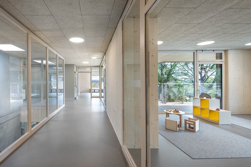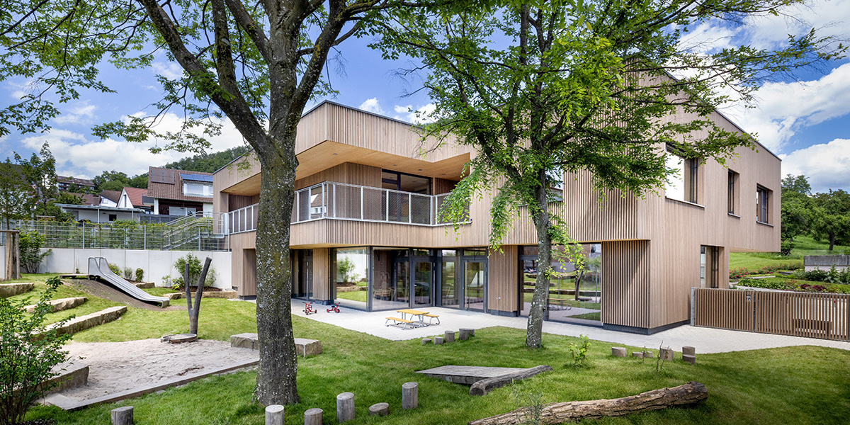 Gebäude I InnenraumgestaltungDas zweigeschossige, winkelförmige Kindergartengebäude mit seiner einfachen und klaren Grundrissstruktur bietet Platz für 40 Kinder. Die U3- und Ü3-Gruppenräume mit Schlafräumen befinden sich im Obergeschoss. Die Funktionsräume im Erdgeschoss. Der barrierefreie und wettergeschützte Gebäudezugang im EG erfolgt über einen Hof an der Mönchbergerstraße, oberhalb der Grundschule. Die zwei Geschosse sind durch einen Aufzug barrierefrei verbunden. Alle Räume haben eine Akustikdecke aus Holzwolleplatten. Die Atmosphäre im inneren strahlt durch seine vielen Öffnungen nach draußen und der abgestimmten Farb- und Materialwahl "erdige Beigetöne" und "hellem Nadelholz" Wärme und Naturverbundenheit aus. Alle Einbaumöbel wurden den Holzoberflächen angepasst und runden das einheitlich gestaltete Gesamtbild ab.