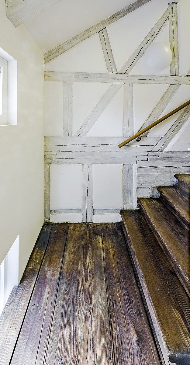 MaterialkonzeptAuch aus pädagogischer Sicht erscheint uns der Erhalt möglichst vieler Bauteile erstrebenswert, da dadurch den Kindern die handwerkliche Bearbeitung von Materialien und ihre Alterung haptisch und sinnlich erlebbar gemacht werden kann. So kann beispielsweise die Oberflächenqualität eines von Hand behauenen Eichenbalkens Materialqualitäten verdeutlichen und zum spielerischen Umgang mit unterschiedlichen Materialien inspirieren. Ebenso kann eine knarrende Treppe oder ein abgenutzter Holzhandlauf die Erfahrungswelt der Kinder positiv bereichern, die in der perfekt genormten Welt der industriellen Fertigung häufig verloren geht. Bei der Modernisierung des Gebäudes wird Wert auf den Erhalt historischer Details und Materialien gelegt. Gerade das Unperfekte, Krumme oder Abgenutzte kann so eine unverwechselbare Atmosphäre schaffen.