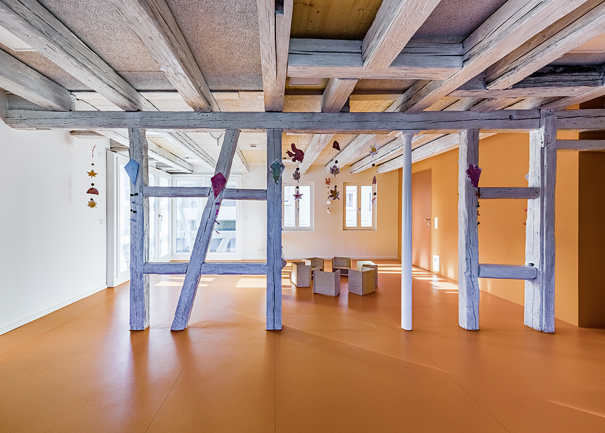 FarbkonzeptUm den Unterschied zwischen der originalen Bausubstanz und den Ergänzungen erlebbar zu machen, wird das Bestandsmaterial geweißelt, gekalkt oder hell lasiert. Die hinzugefügten Materialien behalten ihre Material-Farbigkeit. Die Farbgebung der Bodenbeläge ist in jedem Stockwerk anders. Jeder Gruppe und dem Familienzentrum sind jeweils eine Farbe zugeordnet, für die Kinder Orientierung und Identifikation.