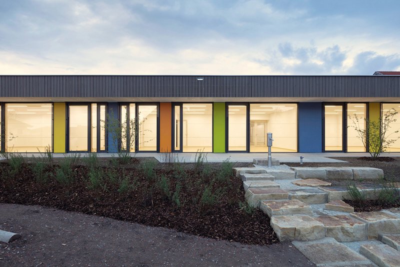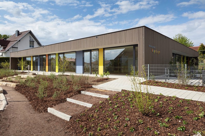 Konstruktion, Materialität, HaustechnikHolz als natürliches und nachhaltiges Material ist primärer Baustoff: Die Konstruktion wurde als Holzrahmenbau mit Holzbalkendecke erstellt. Lamellen aus Lärche verleihen der Fassade eine selbstverständliche Natürlichkeit. Die dezent eingesetzten Farbelemente unterstreichen, den spielerischen Charakter des Gebäudes, und sind identitätsstiftend für ein offenes, fröhliches Haus für Kinder.