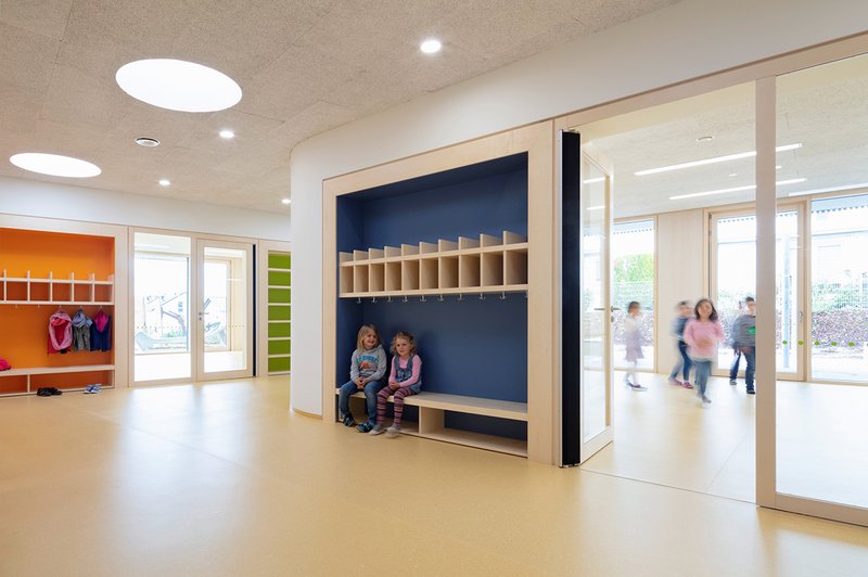 Die Farben der Garderoben entsprechen dem pädagogischen Konzept und sorgen neben der fröhlichen Geste zusätzlich für Orientierung zu den Gruppen.
