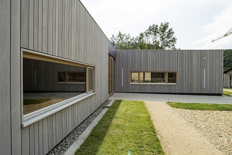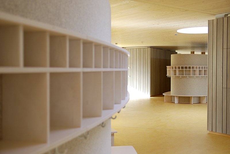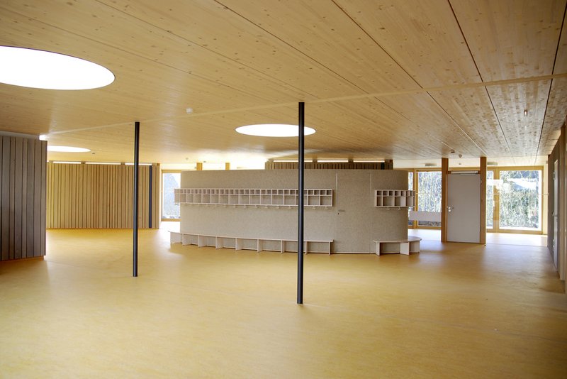 Ein großzügiger Spielflur mit den Garderoben ist Begegnungsraum für die Kinder und erschließt die einzelnen Funktionen und Nebenräume. Durch große Öffnungen in der Fassade wird der Kindergarten von Tageslicht durchflutet und ein unmittelbarer Zugang in den Garten ermöglicht. Das eingeschossige Gebäude wurde in Holzständerbauweise errichtet und nach oben durch ein flaches Dach aus Massivholzelemente begrenzt.