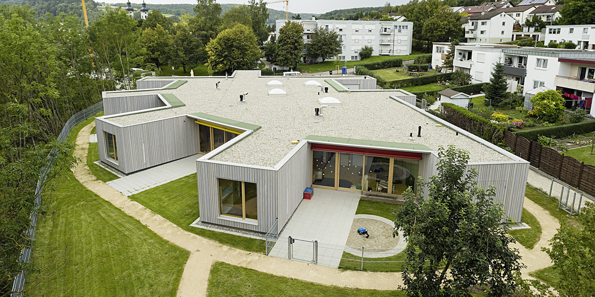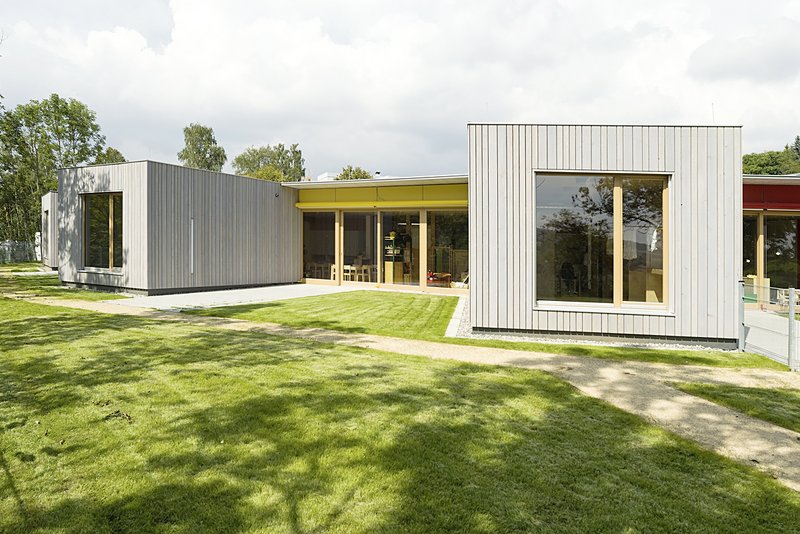 2012 entschieden sich die Kirchen- und Weltliche Gemeinde für den Neubau eines dreigruppigen Kindergartens mit Kinderkrippe. Der Entwurf sah ein Konzept aus unter einem gemeinsamen Dach versammelten Holzboxen vor, zwischen denen sich die einzelnen Gruppenräume aufspannen.