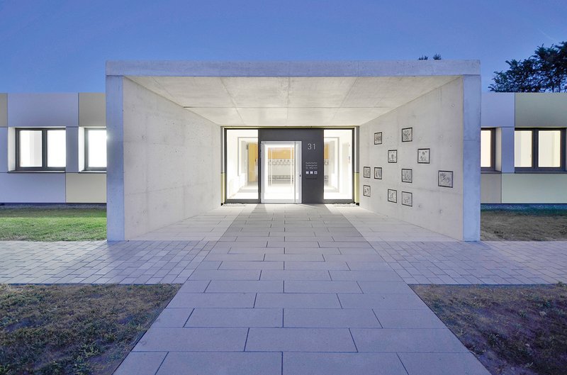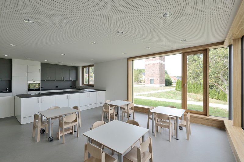 Funktionale Defizite im Bestandsbau wie eine fehlende, barrierefreie Toilette und ein fehlender Materialraum wurden gelöst. Das Haus sollte um einen Anbau im nordöstlichen Bereich für eine Gruppe (3-6 Jahre) mit Schlaf- und Intensivraum, einen Essraum und eine Küche erweitert werden. Die Küche wurde im Zuge der Umstrukturierung des Bestandes in den Anbau verlegt. Eingangsbereich und Vordach wurden erneuert. Zur Unterbringung der Kinderwägen und Krippenwägen sowie Fahrradstellplätzen wurde auf der Nordostseite ein überdachter Anbau in die Erweiterung integriert.