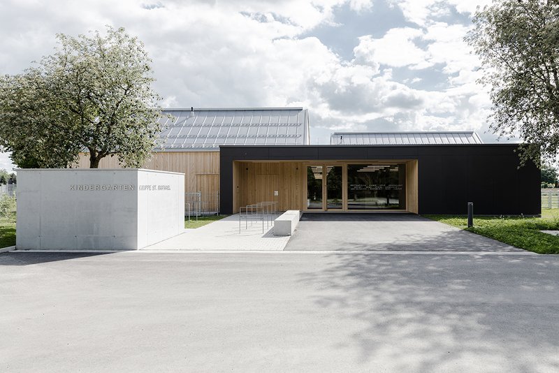 In Wangen-Primisweiler wurde nun der Neubau für die viergruppige Kindertagesstätte St. Raphael in Betrieb genommen. Der Neubau dient auch als Familienzentrum für den Gemeindeteil Wangen-Schomburg mit momentan knapp 2.500 Einwohnern. Kooperationen mit verschiedenen Institutionen wie der Waldakademie Wangen e. V. bestehen bereits und sollen zukünftig noch weiter ausgebaut werden. Das Grundstück, knapp 4.000 m2 groß, liegt am südlichen Ortsrand von Primisweiler. Es wurde mit Bedacht ausgewählt: Der bestehende Sportplatz wurde halbiert, so dass keine neuen Bauflächen beansprucht werden mussten &ndash sozusagen eine „Nachverdichtung“ im ländlichen Raum. In unmittelbarer Nachbarschaft befinden sich bereits die Grundschule und die Sporthalle, Synergieeffekte bei gemeinsamen Unternehmungen und gegenseitiger Unterstützung sind zu erwarten und auch gewollt. „Die Situation ist außergewöhnlich. An diesem Ort, am Übergang von Ortschaft zur freien Landschaft, einen Kindergarten planen zu dürfen, ist eine einmalige Aufgabe und Herausforderung“, so Architekt Gerhard Feuerstein aus Lindau. „Die Ausblicke, die Beziehungen zur Naturlandschaft sind einzigartig. An schönen Tagen bilden die Alpen mit dem beindruckenden Alpsteinmassiv den Horizont. Ohne eine einzige öffentliche Straße queren zu müssen, können die Kinder mit den Erzieherinnen bis zum nahegelegenen Erholungsgebiet Blausee wandern. Besser geht es vermutlich nicht“. Insgesamt 80 Kinder von ein bis sechs Jahren werden hier betreut, einige sind von morgens bis spätnachmittags hier. Lichtdurchflutete Räume, unbehandeltes Holz und Bezug zum Freien in allen Bereichen sind daher besonders wichtig.