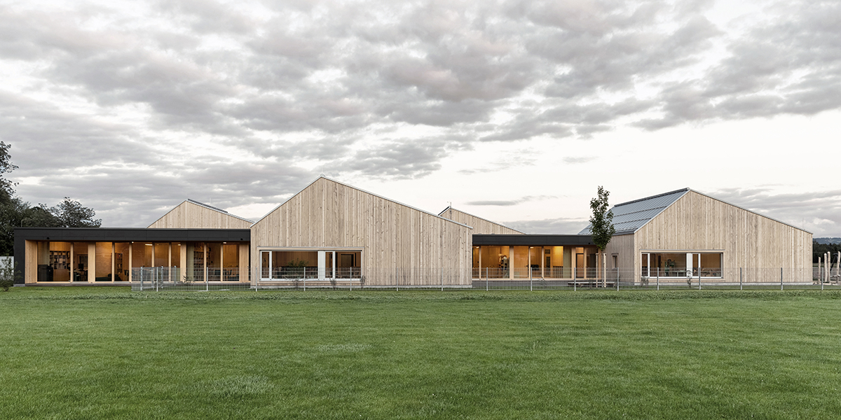 Ein eingeschossiges, reich gegliedertes Gebäude kann die gestellte Aufgabe lösen. Der angrenzende Freiraum sollte dabei überall Teil des Hauses werden. Ablesbare Gruppenhäuser in der Maßstäblichkeit und Form der angrenzenden Wohnhäuser, dazwischen gefasste Höfe bilden das grundlegende Entwurfskonzept. Der Neubau ist ganz aus Holz gebaut. Dieses lebendige Material passt wunderbar zur Situation und zur Nutzung. Die Fassaden sind großteils mit unterschiedlich breiten, unbehandelten Weißtannehölzern verkleidet. Mit der Zeit wird das unbehandelte Holz in Abhängigkeit der Bewitterung unterschiedlich vergrauen und das Ensemble noch stärker in das natürliche Umfeld einbinden. Die Holzkonstruktion („Rohbau“) besteht aus vier gleichen Satteldächern aus Sparrenelementen sowie einem Flachdachbereich aus Brettsperrholz. Die Dächer ruhen auf Unterzügen und Stützen sowie auf Außenwänden in gedämmter Holzrahmenbauweise und Brettsperrholzwänden in den Innenbereichen. Die Aussteifung erfolgt selbstständig durch den Holzbau. Die Bodenplatte wird in konventioneller Bauweise hergestellt. Sie ist das einzige Massivbauteil der Konstruktion.