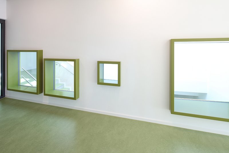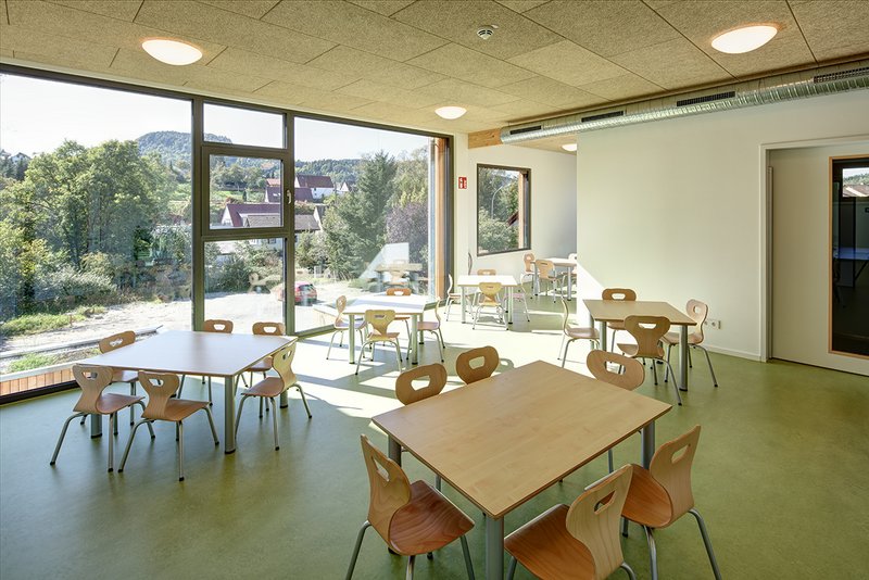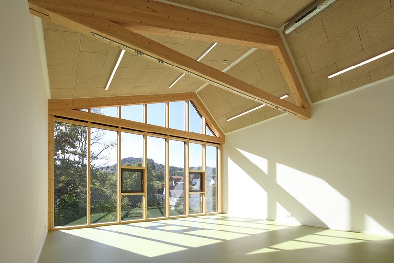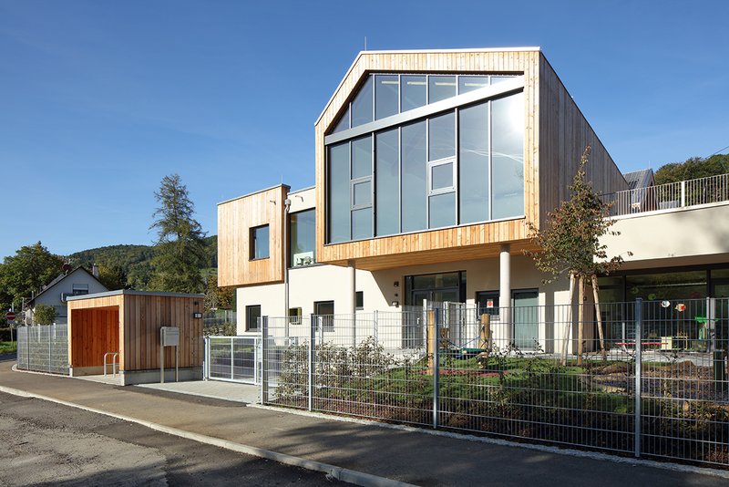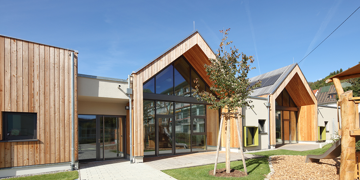 Konstruktion und FassadeDas Gebäude gründet auf einer tragenden Bodenplatte mit Schaumglassschotterdämmung und ist im Erdgeschoss in massiver Bauweise aus Stahlbeton mit vorgesetztem Wärmedämmverbundsystem gebaut. Die Decke über dem Erdgeschoss wurde ebenfalls massiv in Stahlbeton ausgeführt und im Außenbereich mit intensiver Begrünung versehen. Das Obergeschoss ist in Holzständerbauweise mit senkrechter Leistenschalung aus Lärche ausgeführt. In den jeweiligen Geschossen befinden sich leicht auskragende Kastenfensterelemente, die gleichzeitig als Sitzgelegenheit für die Kinder dienen. Die Nischen der Kastenfenster sind ebenfalls in Holz ausgeführt, um für ein kindgerechtes Raumgefühl zu sorgen. Die Decken über Obergeschoss wurden als Brettstapeldecke ausgeführt und extensiv begrünt.