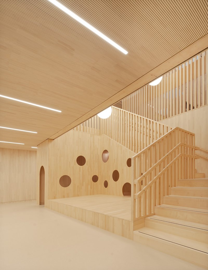 MIKROBLICKBei der Architektur haben wir großen Wert gelegt, dass den Kindern der Übergang von dem eigenen Zuhause in die KITA erleichtert wird. Zudem dient das integrierte Familienzentrum den Menschen im Quartier als Anlauf- und Vermittlungsstelle für Bildungsangebote.Der Grundriss entwickelt sich um die Halle mit inszenierter offener Holztreppe als „Bühne“ und großen Oberlichtern in der Mitte des Hauses. Die Halle bildet das pulsierende Herz und die Verbindung der zwei Geschosse. Im Erdgeschoss gruppieren sich das Familienzentrum, die Verwaltungsräume, eine Krippe-Gruppe und der Essraum für alle Kinder. Über faltbare transparente Innenwände lässt sich das Familienzentrum großzügig öffnen und der Halle zuschalten. Ebenso kann der Essbereich der Krippen-kinder zum Essbereich der „Großen“ geöffnet werden.Das Obergeschoss ist das Reich der vier KITA-Gruppen mit Mehrzweckraum. Dabei wurde das offene pädagogische Konzept optimal umgesetzt mit einer zentralen Garderobe und den nach außen liegenden Themenräumen. Die Kinder kommen an und entscheiden sich in welchen Raum sie gehen möchten. Ein Wechsel von Raum zu Raum ist spielend einfach.