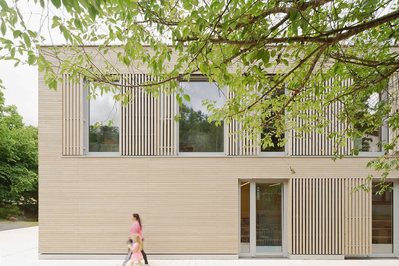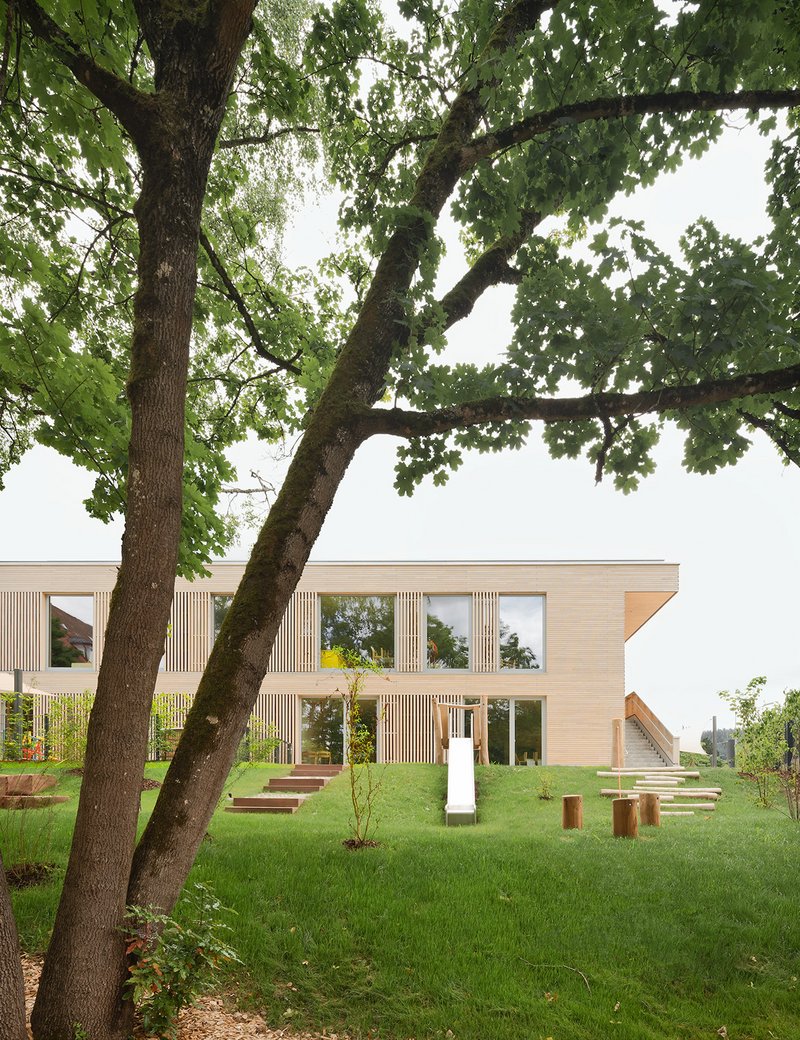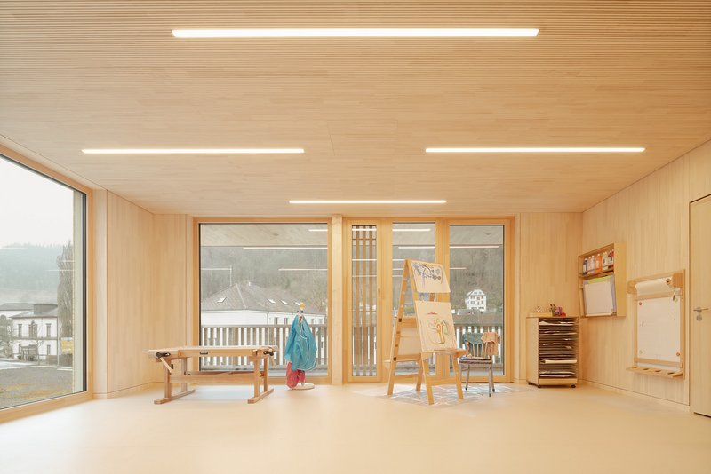 AUSDRUCK, MATERIAL UND ÖKOLOGIE Die KITA ist als reiner Holzbau aus regionalem Tannenholz errichtet. Das Wechselspiel von horizontalen und vertikalen Holzelementen in der Fassade und eine feinsinnige Gestaltung lockern den Kubus auf und machen neugierig auf innen: Hier dominieren ebenso Holzoberflächen in Weißtanne und tauchen zusammen mit dem naturfarbenen Fußboden den Innenraum in ein warmes Universum. Dachoberlichter betonen die innenliegende Mitte mit Bezug zum Himmel. Sonnengelbe, textile, außenliegende Markisen wirken der Überhitzung im Sommer entgegen und unterstreichen den freundlichen Charakter des Hauses. Holzständerbauweise, Holzfaserdämmstoffe, Wärmepumpen auch für Kühlung im Sommer mit Energie aus vollflächig ausgelegten PV - Modulen und extensiv begrüntes Retentionsdach sind die Bausteine der Stunde. Das Gebäude erreicht KFW 40 Standard, ist CO₂-neutral und benötigte wenig graue Energie für die Errichtung.
