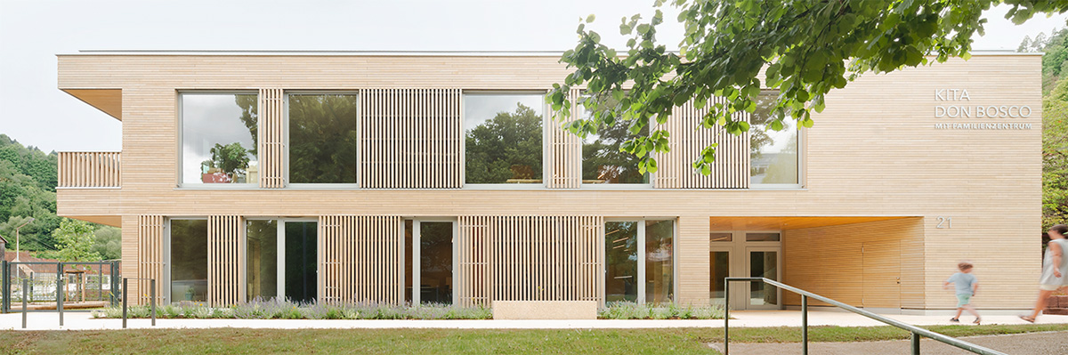 MAKROBLICKDie 5-gruppige KITA „Don Bosco“ mit Familienzentrum ist der erste Baustein und wichtiger Impuls der Entwicklung des neuen Schulcampus in der Talstadt von Schramberg. Als nördlicher Endpunkt des Campus bildet der Neubau eine eigene Adresse an der Graf-von-Bissingen-Straße. Das 2-geschossige Gebäude erhebt sich östlich, gut sichtbar über die Bundestraße und fungiert als Ort der Identifikation für den Stadtteil und noch darüber hinaus.