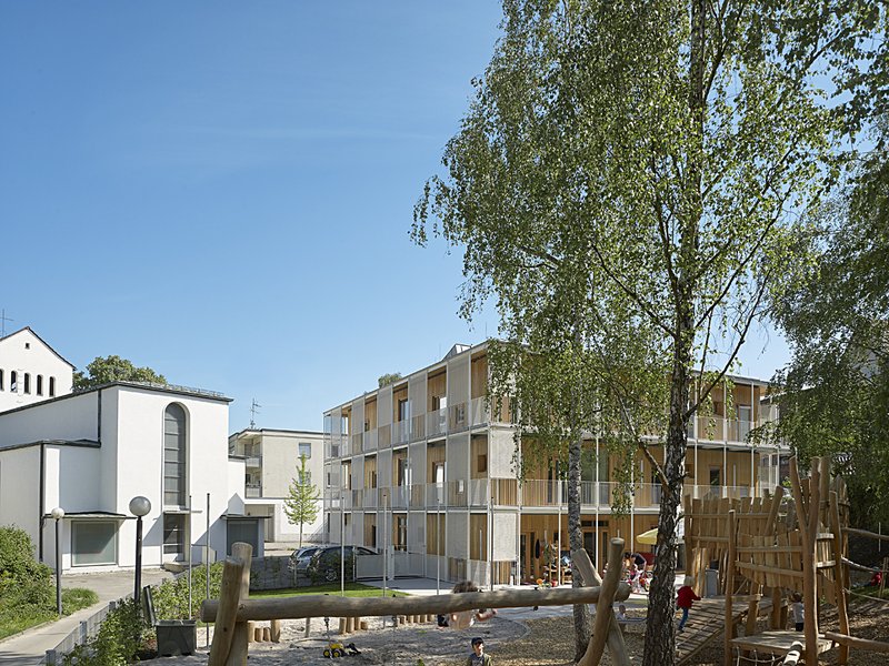 Das Gebäude ist dreigeschossig in Holzständerbauweise errichtet. Die umlaufenden Fluchtbalkone als Stahlkonstruktion mit aufgelegten Betonfertigteilen bieten zugleich einen konstruktiven Holzschutz. Vor dem Kubus mit seiner hinterlüfteten offenen Leistenschalung aus unbehandelter Lärche bilden die leichten, weißen Geländerfüllungen und Sonnenschutzelemente der Stahlkonstruktion eine zweite Fassadenebene. Dies führt zu einem differenzierten Erscheinungsbild und vermittelt zum Gebäudebestand der Kirche und des Gemeindezentrums.