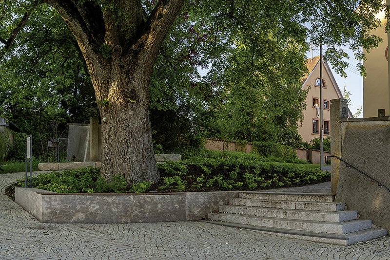 Zentraler Entwurfsgedanke war die Schaffung einer neuen Dorfmitte vor der Kirche St. Hilarius. Hierzu wurde die Kirchenmauer im Bereich der vorhandenen Winter-Linde, welche mit 400 Jahren als einer der ältesten Bäume des Schwarzwald-Baar-Kreises zählt und als Naturdenkmal eingestuft ist, geöffnet. Dadurch entstand eine Sichtverbindung vom Kirchplatz zum Backhäusleplatz. Das Tor wurde entfernt und die Torpfeiler wiederverwendet.