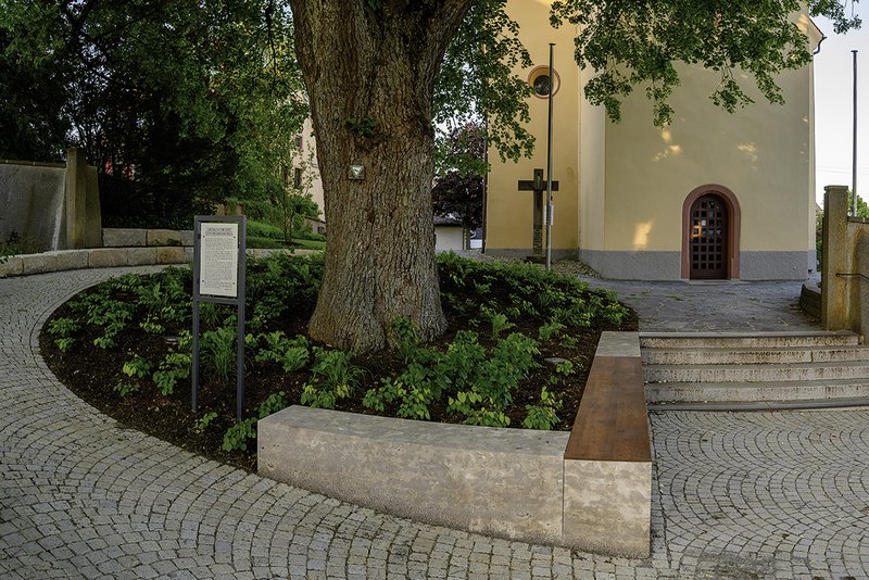 Ein weiteres Anliegen der Einwohnerschaft war ein barrierefreier Zugang zur Kirche. Die gepflasterte Rampe verläuft nun halbkreisförmig um die Linde zum Kircheneingang. Eine Quadersteinmauer aus gespaltenem Jura-Kalk begleitet den Weg und stützt das Gelände hinter der Rampe ab.