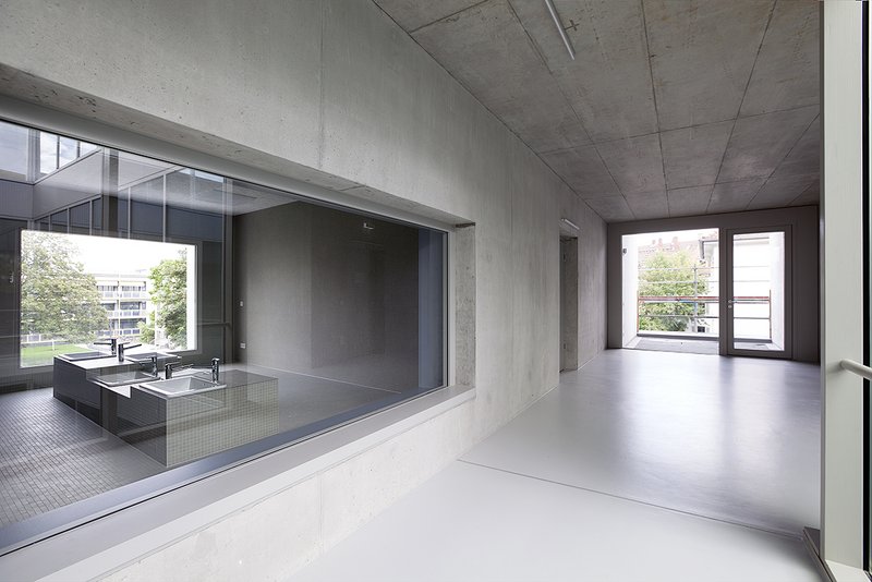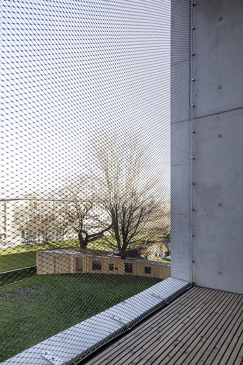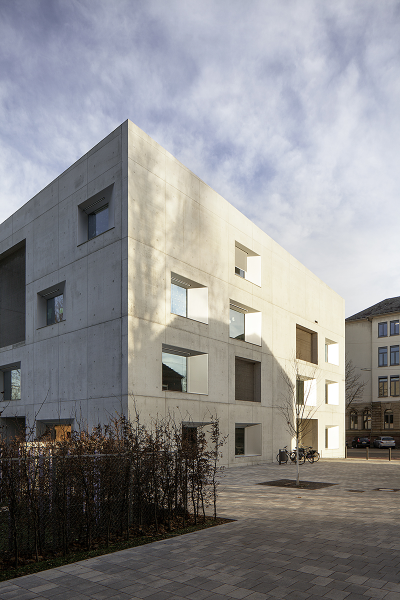 Die massiven Sichtbeton-Außenwände sind aus hochdämmendem Leichtbeton mit innenliegender, mineralischer Dämmung realisiert, damit die massive Konstruktion innen und außen erlebbar wird. Die Außenfassaden sind geprägt durch die unregelmäßige Anordnung der großen Loggien und Fenster. Es finden nur wenige Materialien und zurückhaltende Farben Verwendung. Die Erschließungsbereiche sind als Sichtbeton belassen, die Gruppenräume, Personalbereiche und Bäder kontrastieren hingegen als weiche und dezent farbige Rückzugsorte. Die Holzfenster bestehen aus einer großen Festverglasung und einem Lüftungsflügel, der sich hinter einer schräg angeordneten Fensterlaibung aus Aluminiumlochblech verbirgt. Die Laibungsbekleidung bildet in ihrer Feinheit einen Kontrast zur rauen Betonfassade. Das Gebäude wurde als energetisches Modellprojekt im Rahmen der Exzellenzförderung des Bundes realisiert.