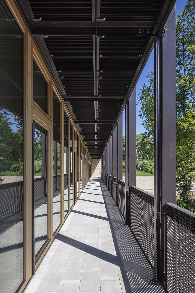 Alle Gruppenräume sind nach Osten zum Außenspielbereich orientiert. Ihnen vorgelagert sind überdachte Spielbereiche. Diese sind gut besonnt und geschützt von den Westwinden, die frei über das Rheintal auf das Gelände treffen. Für die Räume im Obergeschoss dienen diese so ausgebildeten Spielbalkone gleichzeitig als Rettungsweg und Zugangsmöglichkeit zum Außenspielbereich.