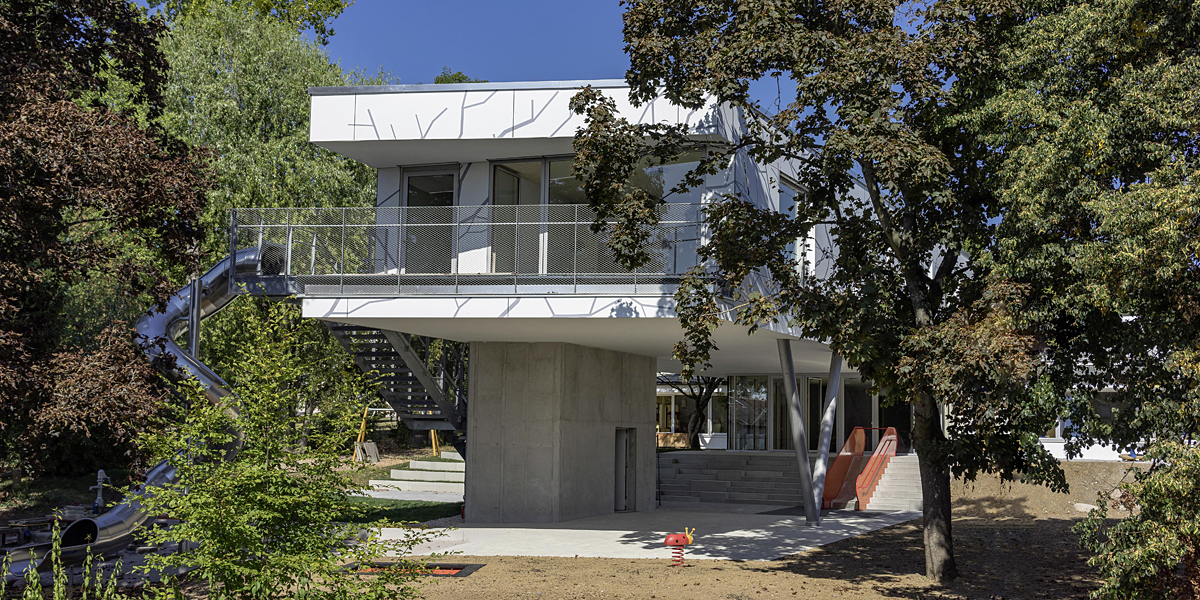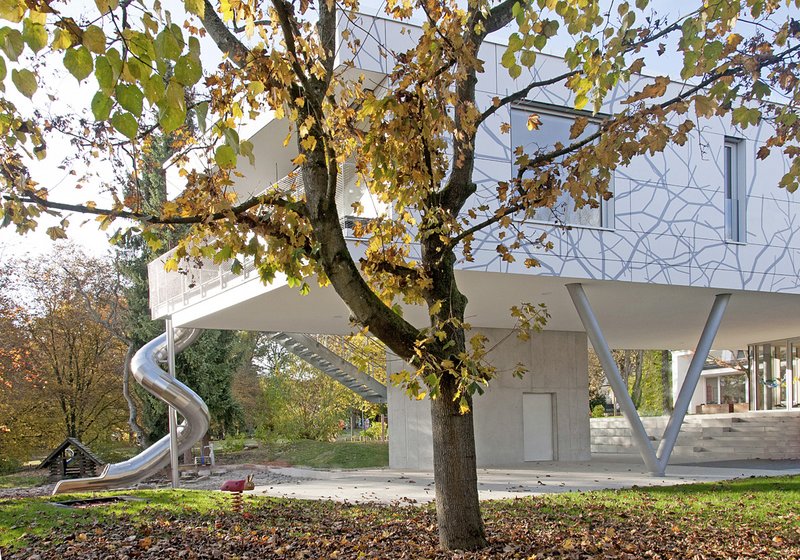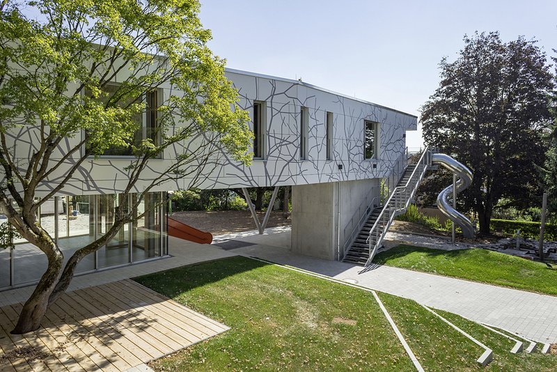 Alle Gruppenräume und Aufenthaltsbereiche der Krippe im Obergeschoss erhalten großzügige Verglasungen und erlauben Ausblicke auf die bestehenden Bäume auf dem Grundstück und dem des angrenzenden Parks. Durch das leicht abfallende Grundstück hat man von der Loggia im Süden traumhafte Ausblicke über die Stadt Sindelfingen bis in die Nachbarstadt Böblingen. Eine an die Loggia anschließende Tunnelrutsche verbindet im Sinne der Aufgabe das Obergeschoss mit dem Garten spielerisch zu einer Spiellandschaft und macht das Haus selbst zum Lernobjekt.