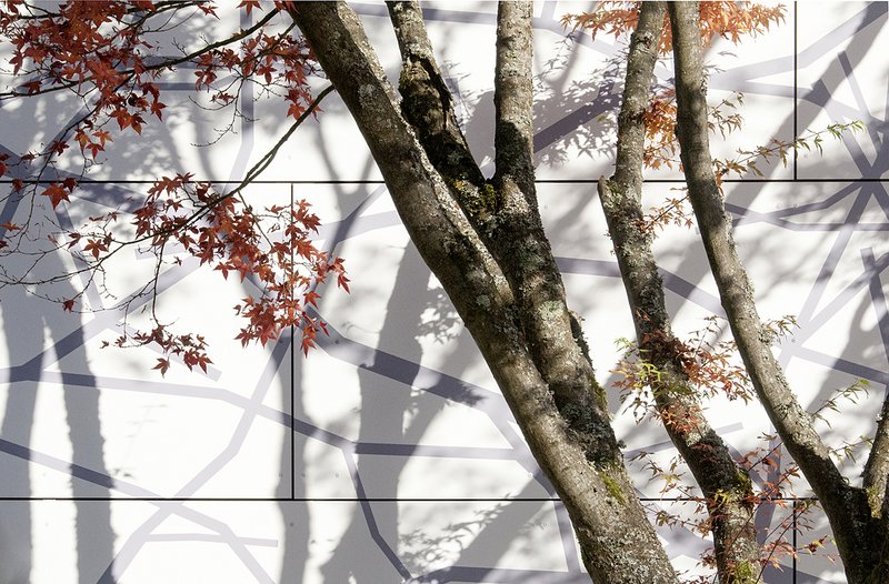 Mit Hilfe digitaler Prozesse in der Entwurfs- und Ausführungsplanung sowie neuester Fertigungsmethoden im digitalen Druckbereich wird die Idee, eine Transformation der vorhandenen Baumlandschaft auf die Fassadentafeln aufzudrucken, umgesetzt und lässt dadurch den neuen Baukörper mit seiner Umgebung verschmelzen.