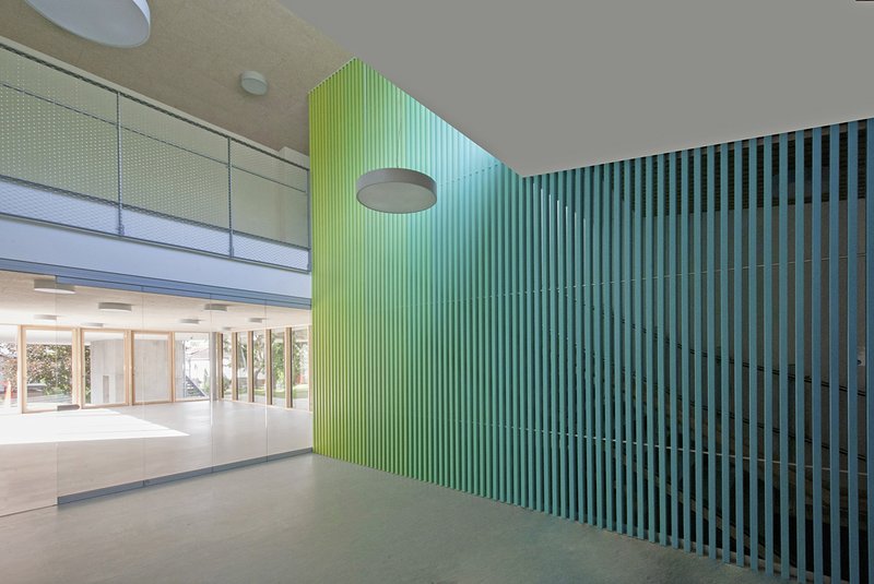 Wegebeziehungen im Stadtteil bleiben durch Erhalt des bestehenden Eingangs unverändert und dienen somit der Verortung im Quartier. Das an den Eingang anschließende Foyer mit Übergang zum neuen Mehrzweckraum im Süden wird mit einer einläufigen Treppe ins Obergeschoss räumlich erweitert, erhält einen großzügigen Luftraum und eine blendfreie Belichtung von Norden. Die darüber liegende Galerie erlaubt den Eltern im Wartebereich einen entspannten Ausblick in die kleinteilige Nachbarschaft.