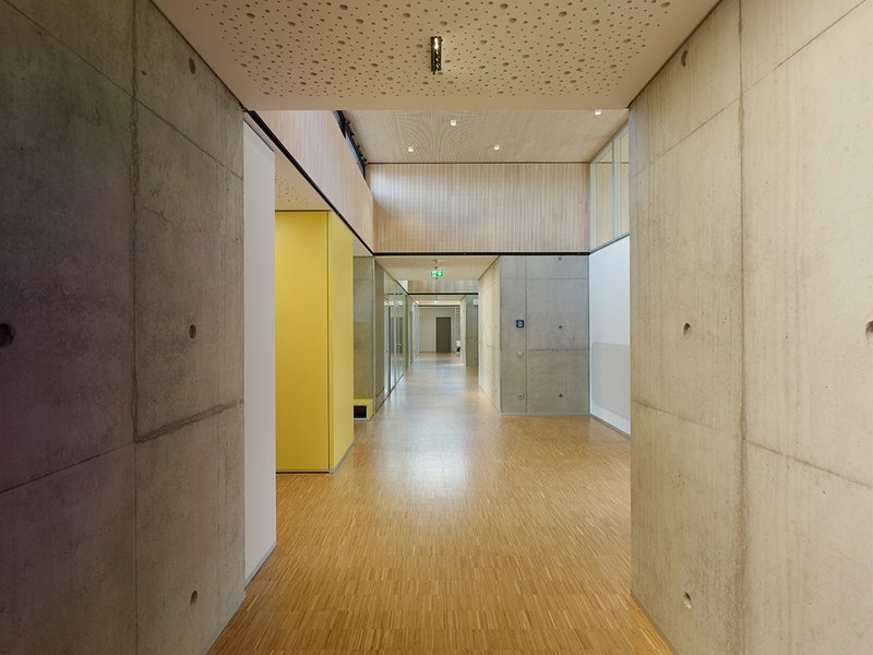 Konstruktion / Baumaterialien / BrandschutzDie Außenhülle des Gebäudes ist in Holzbauweise ausgeführt. Die Außenwände sind als mehrschalige Holzständerwandkonstruktion mit vertikaler Tannenholz-Fassadenschalung errichtet. Die Decken sind kostengünstig als Sparren- oder Brettstapelsystemdecken ausgeführt, welche konstruktiv bereits mit einer Akustikoberfläche aus Tannenholz versehen sind. Die Holzbauweise steht für eine nachhaltige, ressourcenschonende Bauweise. Durch den Einsatz von Tannenhölzern wurden vorwiegend heimische Hölzer (Schwarzwald) verwendet.