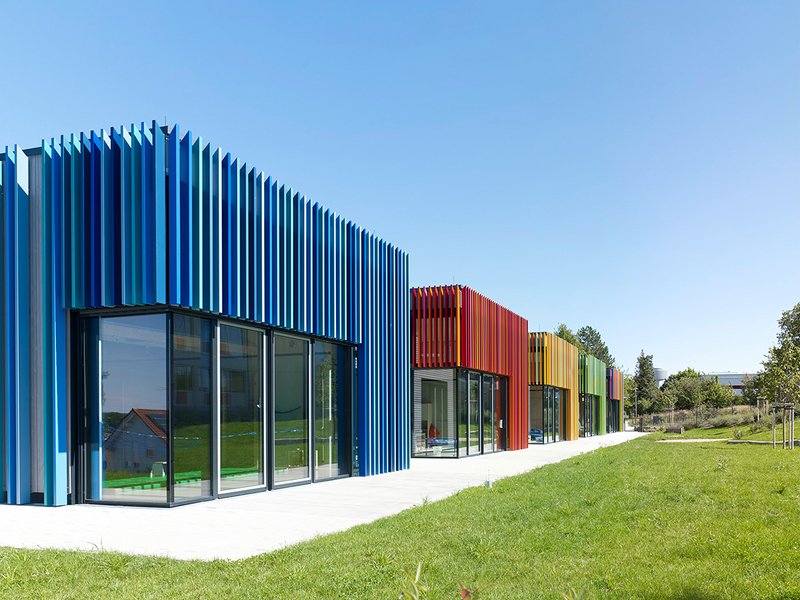 Äußere Gestalt und InnenraumgestaltungDie höheren Baukörper der Kita besitzen ein lockeres ‚Kleid‘ aus farbigen Fassaden-Lamellen, welche als Sonnenschutz und Sichtschutz fungieren sowie der Orientierung inner- und außerhalb des Gebäudes dienen.