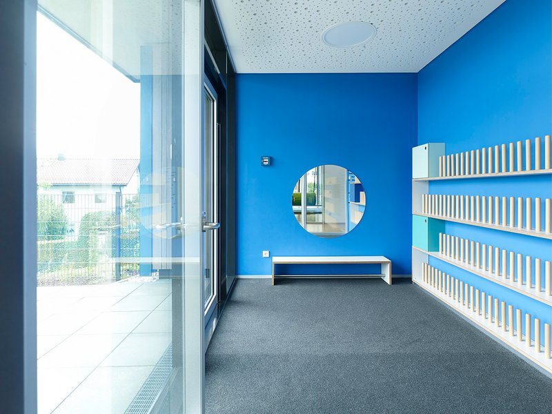 Das Konzept der Lamellen leitet sich aus der Vielfalt der Kinder ab, die morgens mit all ihren unterschiedlichen Persönlichkeiten, Ideen, Wünschen und Erwartungen in die Kita kommen. Dem pädagogischen Ansatz folgend, suchen sich die Kinder ihr Angebot für den Kita-Tag aus und verteilen sich so auf das Gebäude und in die unterschiedlichen ‚Themen‘-Räume. Jedem Bereich wurde ein Grundfarbton zugeordnet.