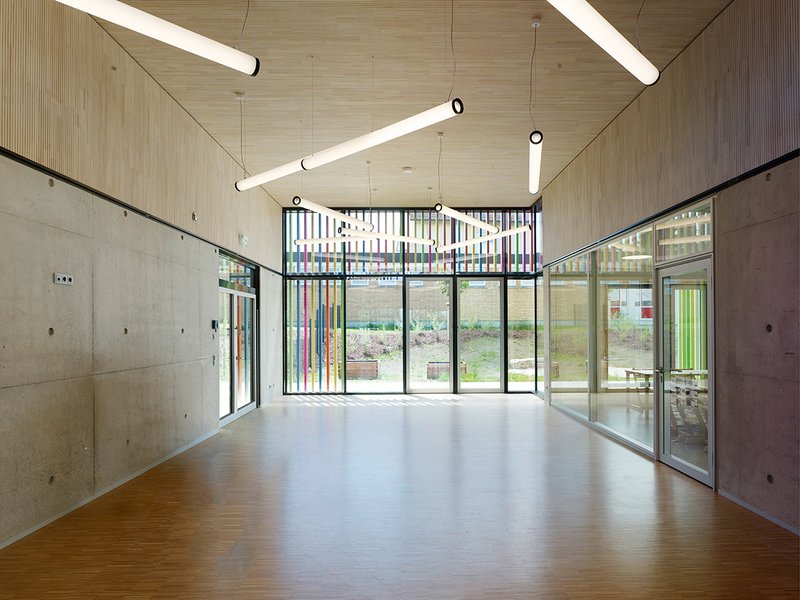 Die Innenwände sind in Massivbauweise in Sichtbeton ausgeführt, um Anforderungen des Brand- und Schallschutzes zu erfüllen, zudem dienen sie der Wärmespeicherung. Die Baumaterialien ‚Beton‘ und ‚Holz‘ sind in Ihrer Ursprünglichkeit für die Kinder erfahrbar und stellen sich bewusst in das Spannungsverhältnis ‚hart‘ und ‚weich‘. Die Oberflächen wurden jeweils als Fertigoberflächen hergestellt und bleiben in den Hauptfunktionsbereichen unverkleidet. Das Gesamtgebäude wurde in einem Bauabschnitt ausgeführt.
