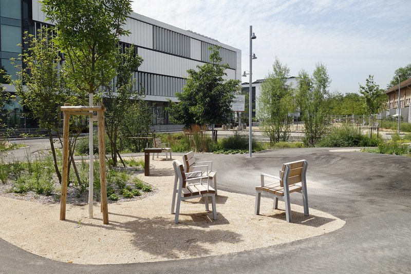 Eine Besonderheit der naturnahen Planung ist der zukunftsgewandte Umgang mit Regenwasser. Über miteinander verbundene Mulden und Mulden-Rigolen-Systeme wird sichergestellt, dass selbst bei Extremregenereignissen das Wasser vor Ort, auf dem Grundstück, verbleibt und versickert. Der blaugrüne Entréeplatz empfängt mit einem Trinkbrunnen, einer großzügigen bepflanzten Sickermulde und vielen robusten Gehölz- und Staudenpflanzungen.