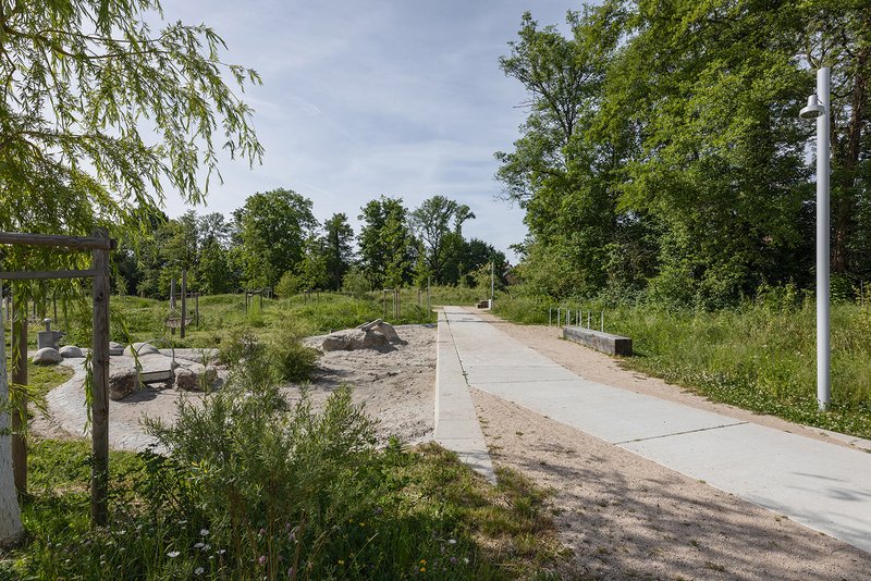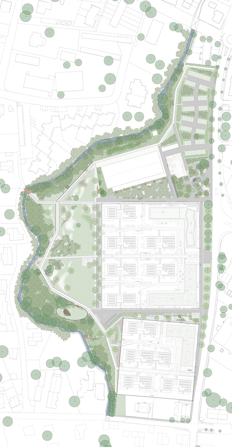 Das städtebauliche Konzept sieht ein kompaktes Stadtquartier aus zwei Baufeldern und ein starkes Freiraumgerüst vor, welches sich entlang des Mühlbachs aufspannt und sich über zwei Anger mit dem Quartier und der umgebenden Wohnbebauung verzahnt. Der großzügige Landschaftspark entlang der Mühlbachaue mit seinem wertvollen Gehölzbestand wird zum verbindenden Freiraumelement das sich über ein engmaschiges Fuß- und Radwegenetz bis in die Innenstadt vernetzt. Entlang des Weges sind Picknickstationen und naturnah gestaltete Spielorte angeordnet. Sie werden umgeben von Auenvegetation und einer Landschaft aus Hügeln und Wiesen. Diese topografische Besonderheit zeugt von der besonderen Herausforderung der Integration aller anfallenden Erdmassen auf dem Grundstück, die sich in der spannenden Modellierung des Parkes wiederfindet. Sitzstufen reichen bis ans Wasser des Mühlbachs. An der neuen Bebauung sorgt eine Promenade für Raum zum Flanieren und für die Ver- und Entsorgung des ansonsten autofreien Quartiers. Mulden nehmen das anfallende Regenwasser aus den Baufeldern auf und lassen es langsam versickern.