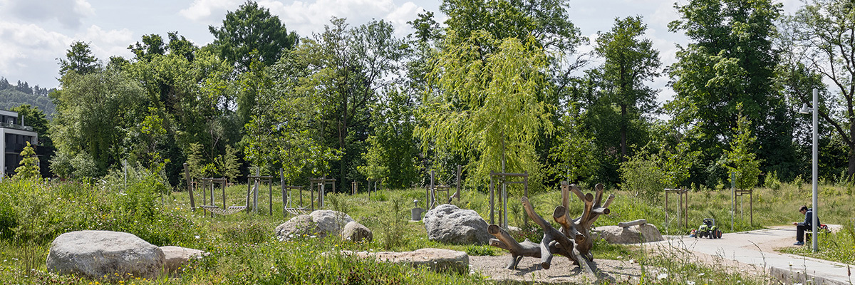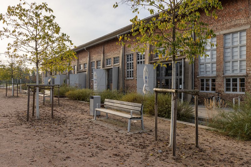 Besonderheiten:- Konversion eines militärischen Altstandortes in der Innenentwicklung in ein mischgenutztes Quartier für Wohnen, Arbeiten und Versorgen auf kurzen Wegen- Schaffung von dringend benötigten Arbeitsstätten und arbeitsnahem Wohnraum für alle Alters- und Sozialgruppen im ländlichen Raum (Neubau Unternehmenszentrale Powercloud GmbH auf den Baufeldern für rund 200 Mitarbeiter:innen, inkl. Design-Budget Hotel und 140 Wohnungen)- Integration historischer Bauelemente (Nutzung Grauer Energie) wie der denkmalgeschützten Reithalle, des Tankstellengebäudes oder dem historischen Männerbad als soziale Treffpunkte und Orte der Identität- Nahversorger und Gastronomie in der Reithalle mitten im Quartier bietet regionale Lebensmittel und andere Waren- Starkes Freiraumgerüst definiert den Städtebau und sichert die Verankerung in das bestehende Stadtgefüge- Sicherung einer klimapositiv wirksamen Fläche im Stadtgebiet- Erlebbarmachen und Zugänglichkeit des vorhandenen Fließgewässers- Erhalt wertvoller Gehölze im Aubereich, Neupflanzungen eines artenreichen und dichten Gehölzbestandes, ökologisch hochwertiger Ansaaten und Unterpflanzungen- Einsatz klimaangepasster Arten- Neugestaltung biodiverser Grün- und Freiräume unter Berücksichtigung der Klimaanpassung im Schwammstadtprinzip (komplette Rückhaltung und Versickerung des anfallenden Regenwassers vor Ort), auch Regenwasser von privaten Parzellen wird auf öffentlichem Grund versickert- Dabei wurden innovative bauliche Lösungen im Umgang mit Regenwasser gesucht. Tiefbeete und Mulden werden selbstverständlich in das Freiraumkonzept integriert, Ein- und Überläufe attraktiv gestaltet. Ein Tiefbeet, das den Baumplatz von den privaten Terrassen der Reithalle trennt, sorgt für Privatsphäre.- Verwendung von versickerungsfähigen und hellen Materialien (Albedoeffekt) in den Außenanlagen- Das Material für offene Deckschichtbeläge (Wassergebundene Wegedecke) und mineralische Stoffe zum Mulchen (für Pflanzflächen) sind regionalen Ursprungs, Findlinge zur Gestaltung von Teilflächen sind lokalen Ursprungs aus diversen Siebvorgängen vor Ort, bei Ausstattungsgegenständen und Spielgeräten mit Holzanteil wurde überwiegend auf langlebige Holzarten wie Eiche und Robinie zurückgegriffen- PV-Anlagen auf allen Dachflächen- autofreies Quartier der kurzen Wege- Aufwertung und Vernetzung der vorhandenen Freiräume mit den übergeordneten Freiraumsystemen Acherns, inklusive dem Rad- und Fußwegenetztes- Förderung klimafreundlicher Mobilität (Neue Brücke über den Mühlbach, Mobilitätsstation mit Carsharing-E-Auto und Nextbike-Leihfahrrädern, überdachte Fahrradabstellanlage und Reparaturstation, barrierefreier Bushaltepunkt zur optimalen Anbindung an ÖPNV)- Schaffung eines blaugrünen, zentrumsnahen Parkplatzes für Tages- / Wochenparker mit acht Ladepunkten für E-Fahrzeuge- Etablierung von Kunst im öffentlichen Raum (Julius-Hirsch-Stehle auf dem Julius-Hirsch-Platz, künstlerische Umgestaltung Tanke58)