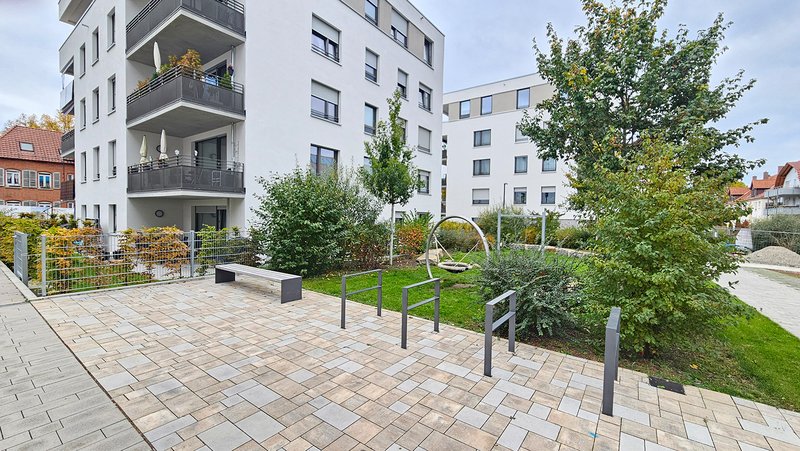 Die Flächen südlich, westlich und östlich des zentralen Erschließungsringes wurden den jeweiligen Gebäuden als gemeinschaftliche Außenanlagen zugeordnet. Das westliche Gebäude (ehemaliges DRK-Gebäude mit Neubau) beinhaltet im EG eine Kindertagesstätte. Diese erhält im Außenbereich langgezogene und schmale, aber vielfältig gestaltete Spielflächen. Allen Gebäuden sind die baurechtlich notwendigen Fahrradstellplätze sowie geeignete Müllaufstellflächen für den Tag der Abholung zugeordnet.
