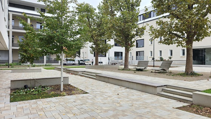 Entsprechend dem Wettbewerbsbeitrag wurden im südlichen und westlichen Bereich acht Bestandsplatanen erhalten. In der Tiefgarage wurden entsprechend große Baumquartiere ausgespart. Insgesamt entstanden klar strukturierte, differenziert gestaltete Freianlagen, die trotz der hohen städtebaulichen Nutzungsdichte zu einer guten Quartiersbildung und Identifikation der Bewohner/-innen beitragen können.