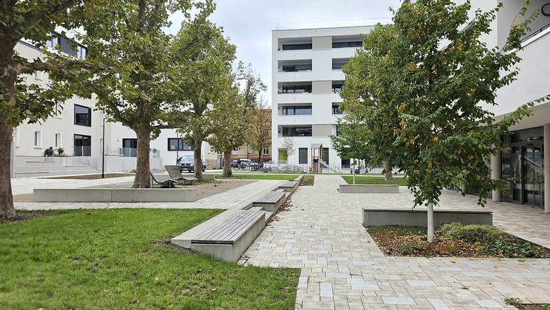 Entsprechend der vorhandenen und geplanten Bebauung erfolgt die Erschließung des Quartiers von der Alt-Württemberg-Allee im Westen und der Jägerhofallee im Osten. Eine Durchwegung des Quartiers ist an zwei Stellen vorgesehen. Dabei nimmt die nördliche Durchwegung die aus Richtung Finanzamt ankommende Fußwegeverbindung auf. Entlang der südlichen Durchquerung sind mit dem Zugang zur KiTa, den repräsentativen Freianlagen des Bürogebäudes BA3, dem Spielplatz unter den vorhandenen Platanen und dem Quartiersplatz mit der Außengastronomie des Quartierscafés öffentlichere, belebte Nutzungen angeordnet, während Richtung Norden privatere, ruhigere Nutzungen den Freiraum prägen. Ein befahrbarer Fußweg als Ringerschließung mit Querstichen, der gleichzeitig als Feuerwehrumfahrt mit Aufstellflächen dient, erschließt die Punkthäuser im Quartiersinneren. An den Knotenpunkten werden jeweils im Wechsel westlich und östlich kleine Platzsituationen angeboten, die als Aufenthalts- und Kommunikationsorte gestaltet wurden.
