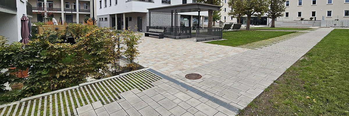 Das Geländeniveau im Quartiersinnern liegt aufgrund der Zwangspunkte der geplanten, unter nahezu dem gesamten Innenraum liegenden Tiefgarage um bis zu 80 cm über dem Bestandsniveau. Zu den beiden flankierenden Straßen entstanden daher geneigte, jedoch barrierefreie Zugangswege mit ca. 4-5 Prozent Neigung. Die Erdüberdeckung der Tiefgarage beträgt im Mittel mindestens 60 cm.