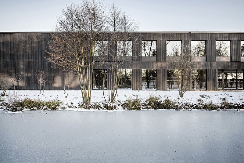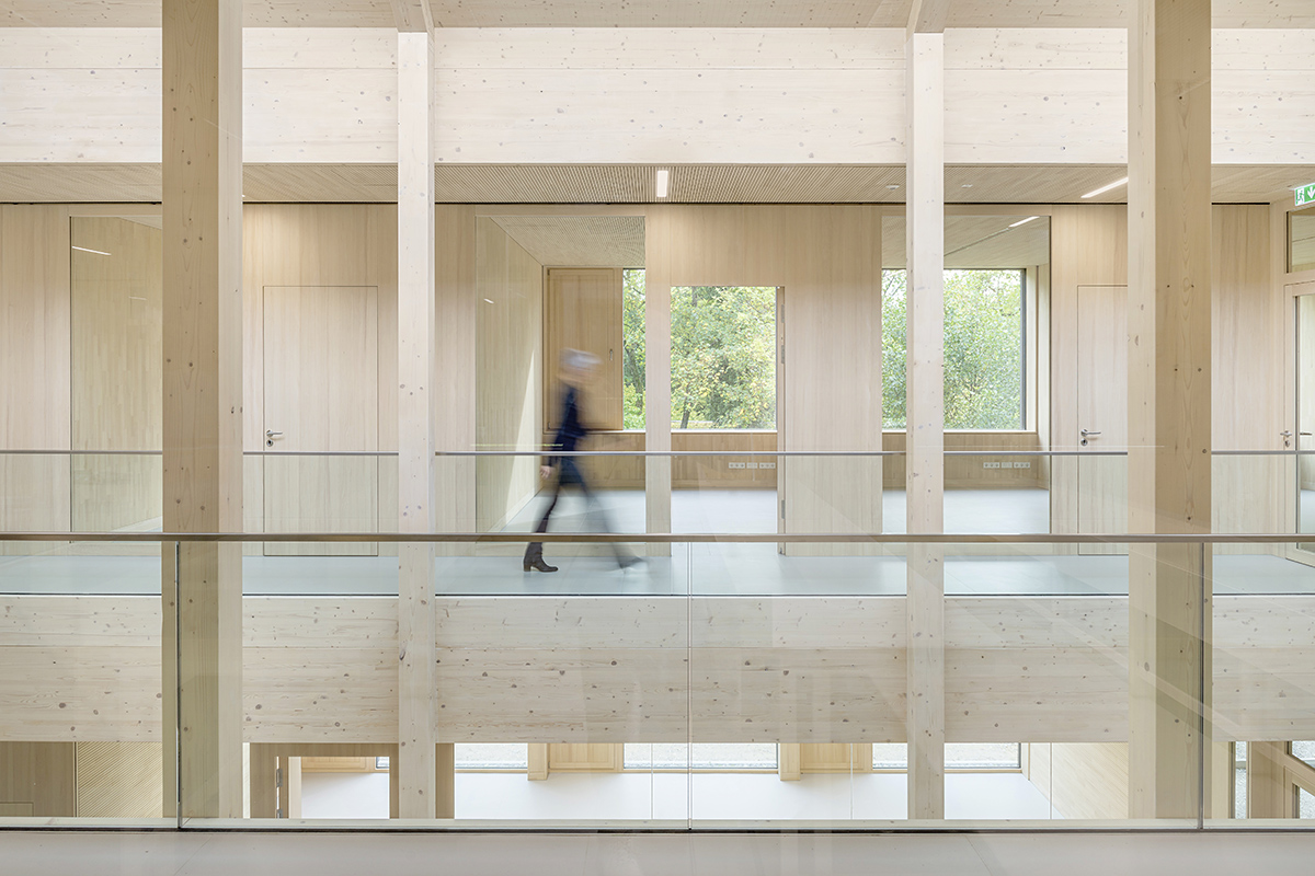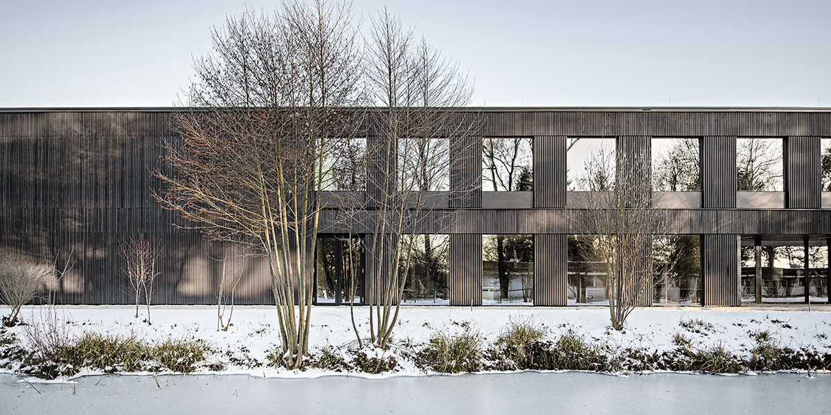 Materialität, Energie und NachhaltigkeitDer Neubau ist als Holzbau mit zwei Stahlbetonkernen und Holz-STB-Verbunddecken konzipiert. Als Laborbau ist er damit in Baden-Württemberg einzigartig. Innen- und Außenfassaden sind in Weißtanne ausgeführt, wobei die Außenfassade im Vorgriff auf eine an diesem Standort zu erwartende dunkle Fleckenbildung anthrazitfarbig lasiert wurde. Von einer chemischen Vorvergrauung mit Fungizidbeimengung wurde aus nachvollziehbaren Gründen bewusst abgesehen. Im Innenraum dominieren neben den sichtbar belassenen Betonbauteilen helle Holzoberflächen und erzeugen mit dem großzügigen Tageslichteinfall auch in der Mittelzone eine hohe Aufenthaltsqualität. Das über die gesamte Gebäudelänge geführte Shed-Oberlicht wurde mit einer nach Süden orientierten PV-Anlage belegt, die übrigen Dachflächen sind begrünt.
