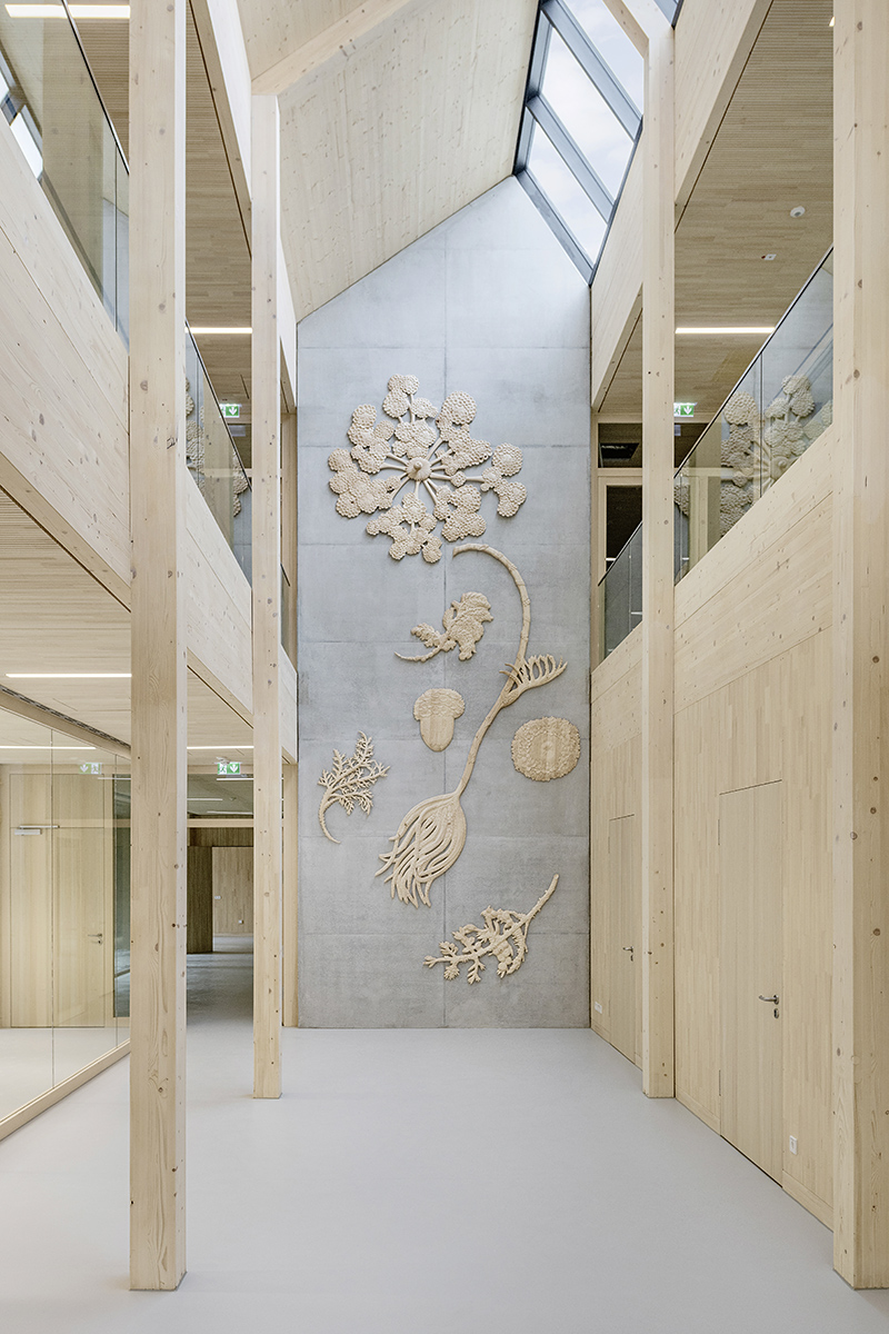 Organisation und GebäudestrukturÜber den teilweise überdachten Vorplatz im Osten gelangt man in einen großzügigen Eingangsbereich, von dem die wichtigsten Nutzungsbereiche direkt erschlossen werden: Der Empfang mit der Probenannahme, der Seminar- und Teeküchenbereich mit überdachter Terrasse, die Versuchsimkerei und das Treppenhaus mit Zugang zu den Büros und Laboren. Das zweigeschossige, zenital belichtete Foyer erlaubt Besuchern, die mit der Landesanstalt nicht vertraut sind, sich schnell zu orientieren. Der Blick fällt auf das von Gabriela Oberkofler konzipierte Wandrelief „die Scharfgabe im Paradies“.