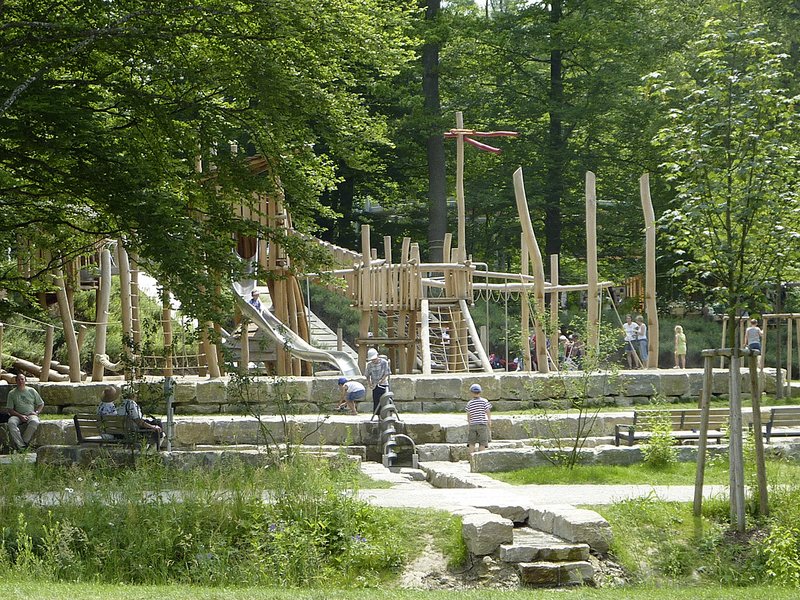 NeckarparkDer Neckarpark besteht aus drei kontrastierenden, in Längsrichtung verlaufenden Zonen unterschiedlicher Inhalte, die durch Wege klar voneinander abgegrenzt sind: der wiederhergestellte Neckar in seinem naturnahen Gewässerbett auf der Ostseite, die lineare Bebauungsschiene auf der Westseite und die keilförmig zulaufende, landschaftsarchitektonisch gestaltete grüne Mittelzone aus Gärten und ruhigen Rasenflächen. Intensiv gestaltete Querspangen, die sich aus der Bebauung heraus bis zum Neckar entwickeln, unterteilen die Längszonen in verschiedene Abschnitte. Diese "Neckargärten" bilden die gestalterischen Schwerpunkte in der Mittelzone. Sie bieten Spielangebote für alle Generationen und strukturieren den Park.