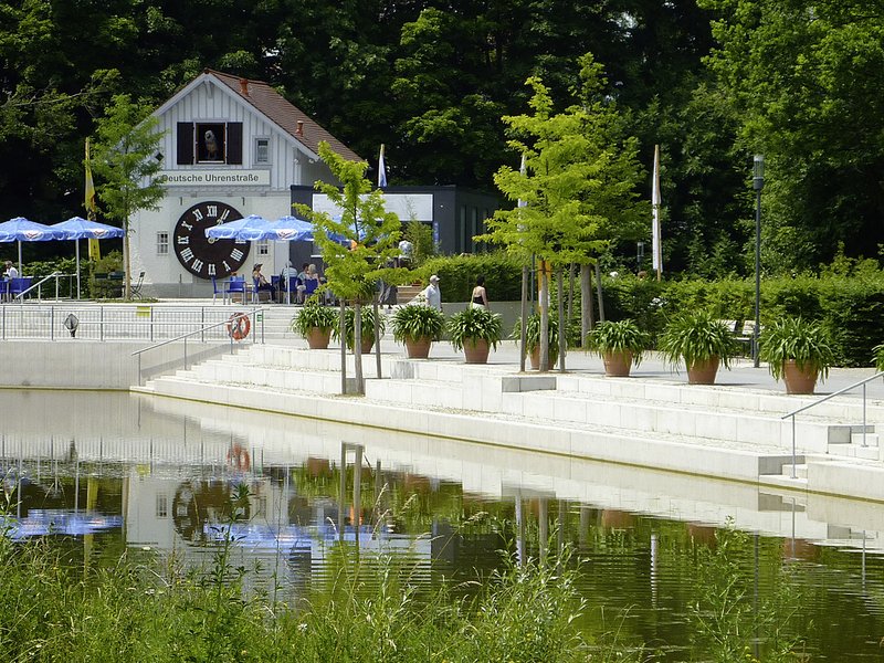 Landschaftspark BauchenbergIn diesem landschaftlichen Teil des Gartenschaugeländes wurden neben der Wiederherstellung des Neckars (der in diesem Abschnitt noch Moosbach heißt) nur wenige dauerhafte Neugestaltungen vorgenommen. Am wichtigsten sind die Anlage eines Wegesystems mit einem Rundweg um den zentralen Bauchenbergweiher sowie eine kleine Plattform mit Steg am Wasser, die in Verbindung mit dem Umbau der Eissporthalle entstanden ist. Auf diese Weise konnte der im Landschaftsschutzgebiet liegende See in naturverträglicher Weise erschlossen und für die Besucher erlebbar gemacht werden.