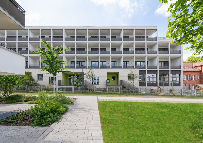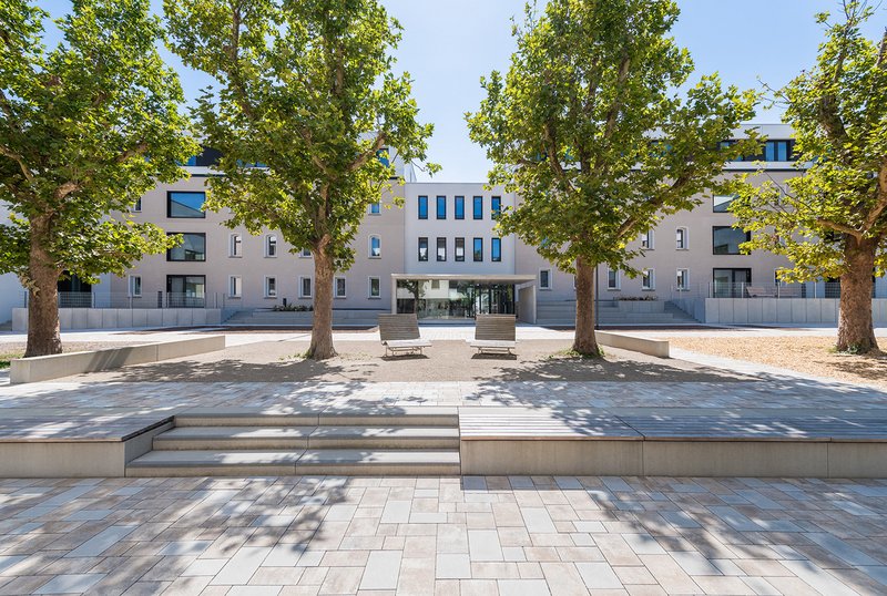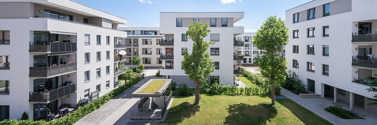 Nach außen, in den öffentlichen Raum spürbar wird die innere Quartiersentwicklung, Nachverdichtung in Architektursprache, Materialität und Ausdruck erlebbar. Sechs Solitäre (sechsgeschossig plus Dachgeschoss) prägen unter Berücksichtigung des identitätsstiftenden Baumbestandes im Süden die grüne Innenhofsituation. Der Baumbestand wurde durch Umpflanzung, Pflege und Wiedereinpflanzung erhalten.