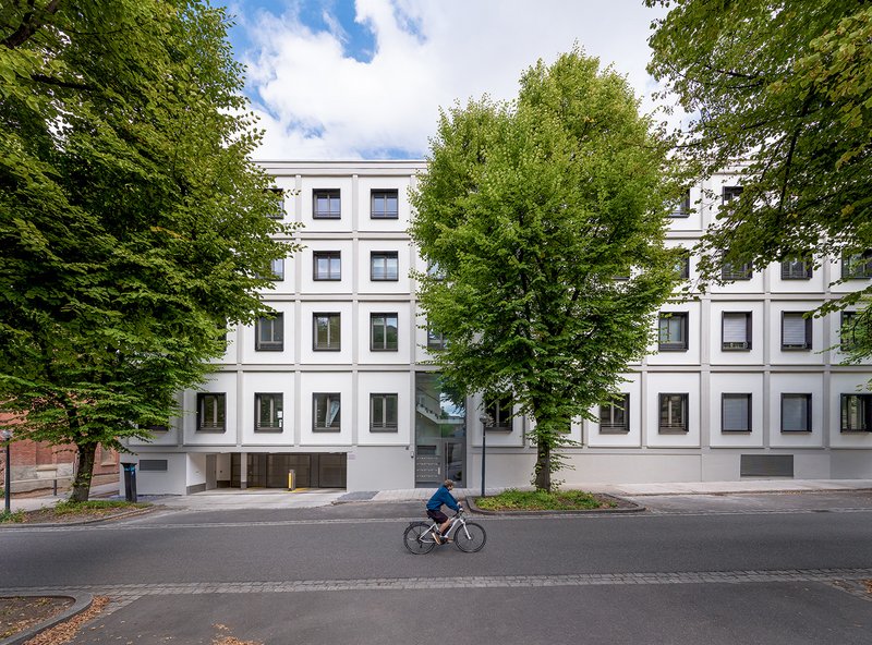 Die 2. Bauphase der Jägerhofkaserne (1937—1938) wurde in Teilbereichen (verbindende Mittelbauten) zurückgebaut. Durch diese Entwurfsentscheidung wird die historischen Gebäudestruktur von 1903 wieder sichtbar. Die eingefügten Neubauten mit neuen Erschließungselementen bilden im Kontext des Bestandes die typische Blockrandbebauung im Übergang zu den östlichen angrenzenden Wohnbebauungen. Mit den ergänzenden Neubauten in den Zwischenräumen der historischen Bausubstanz wird auch ein funktionaler Mehrwert geschaffen: Neue, barrierefreie Erschließungselemente ermöglichen eine sinnvolle Anbindung der versetzten Geschossebenen und unterstützen die Umstrukturierung der Bestandsgebäude zu modernen Wohnungsgrundrissen. Gleichzeitig werden neue Adressen und klare Zugangssituationen entlang des öffentlichen Raums geschaffen.