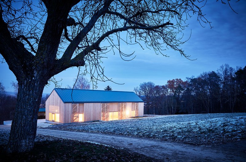 Komplementiert wird der Entwurf durch ein energetisches Null-Emissions-Konzept, bestehend aus einer reversiblen Luft/Wasser Wärmepumpe, einer PV-Anlage und minimierter, dezentraler Lüftungsanlage mit Wärmerückgewinnung, sodass die benötigte Wärme und Energie selbst erzeugt werden kann, ohne weitere Emissionen auszustoßen. Der Einsatz einer in einem sinnvollen Maß eingesetzten, ökologischen Dämmung aus Holzfaser senkt den Primärenergiebedarf in Sommer und Winter. Der außenliegende, flexibel verschiebbare Sonnenschutz vervollständigt das Konzept passiv. Diese Lowtec-Lösung welche ein filigranes Scheunentor zitiert ermöglicht den Verzicht auf technisch aufwendige Fassadenschichten. Eine Regenwasserzisterne sammelt das anfallende Niederschlagswasser, sodass auch diese wertvolle und schützenswerte Ressource gespeichert werden kann und bei der Gartenbewässerung zum Einsatz kommt.