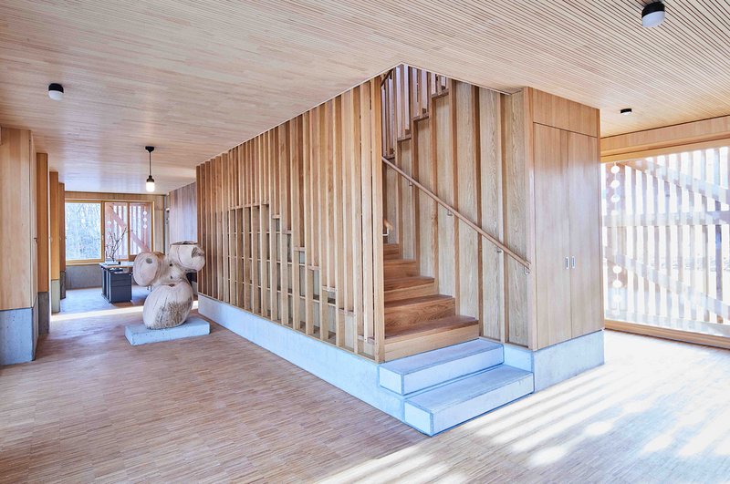 Die gewählte konstruktive Ordnung bietet nun die Möglichkeit, die Qualitäten des zeitgenössischen Holzbaus mit seinen vielfältigen konstruktiven und sinnlichen Qualitäten darzustellen. So finden in der Gebäudehülle und der Zwischendecke heimische Nadelhölzer wie die Douglasie, Weißtanne und Kiefer Verwendung, während im Bereich der Solitärbauteile im Inneren des Gebäudes die Qualitäten von verschiedenen Laub- und Obsthölzern exemplarisch aufgezeigt werden. Durch die komplexe, gestalterische und konstruktive Durchmischung von Holzwerkstoffen und Holzarten können die konkreten Eigenschaften des jeweiligen Baustoffes zielgerichtet Verwendung finden. Dies soll modellhaft aufzeigen, dass der moderne Holzbau die große Bandbreite an Möglichkeiten zur Nadel- und Laubholznutzung in einem Projekt vereinen kann. So wie im Lehrgarten des LOGL die Vielfalt der Streuobstsorten und Baumarten und deren unterschiedliche Qualitäten erfahrbar sein wird, soll dies im Inneren des Gebäudes als nun transformierte Kulturlandschaft in gleichem Maße möglich sein.