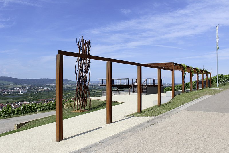 Im Zuge der Rebflurbereinigung in den 1970er Jahren wurde auf einer Restfläche unterirdisch ein begehbarer Frischwasser-Hochbehälter errichtet, das sogenannte „Wasserhäusle“. Die Dachflächen dieses Funktionsbauwerks wurden nun als einer der „Höhepunkte“ im Rahmen des Projekts Landschaftspark Rems mit Aussichtsplattform und einem öffentlichen Platz überbaut. Massive Sitzstufen bilden zusammen mit einem Rankgerüst aus Cortenstahl den Rücken zum Hang hin, während die auskragende Plattform über dem Tal schwebt. Cortenstahl, Eichenholz, Sandstein, sandgestrahlter Beton und wassergebundene Beläge gehen mit den umgebenden Weinbergen je nach Jahreszeit ein Wechselspiel von Oberflächen und Farben ein. Zu sehen ist auch eine Skulptur von Manuela Tirler. Der Platz in den Weinbergen: Ein Aktionsraum inmitten der Reben für Konzerte, Lesungen, Theaterspiel, Degustationen oder einfach für eine Einladung zum Verweilen und Genießen!